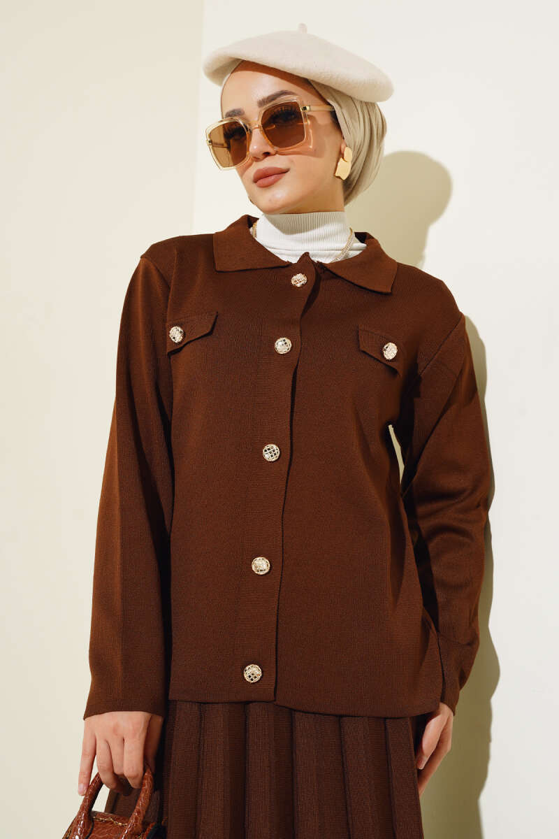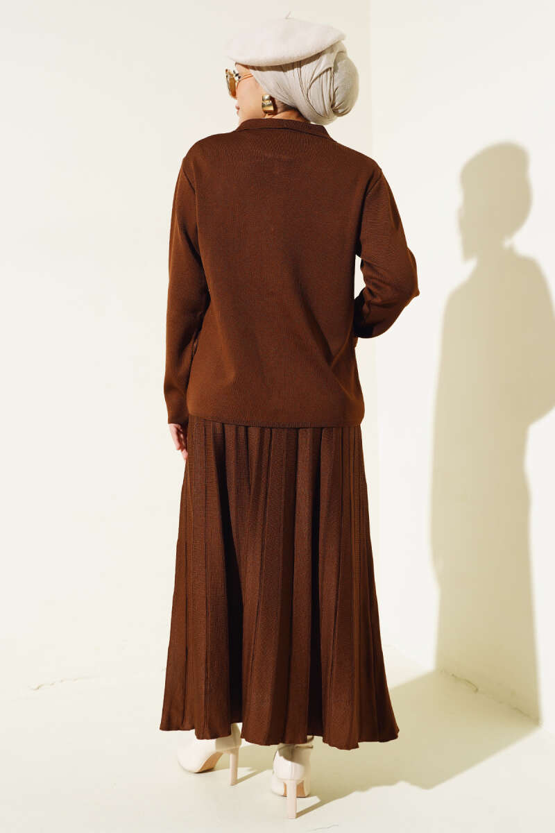 Gömlek Yaka Düğmeli Etekli Triko Takım Kahve