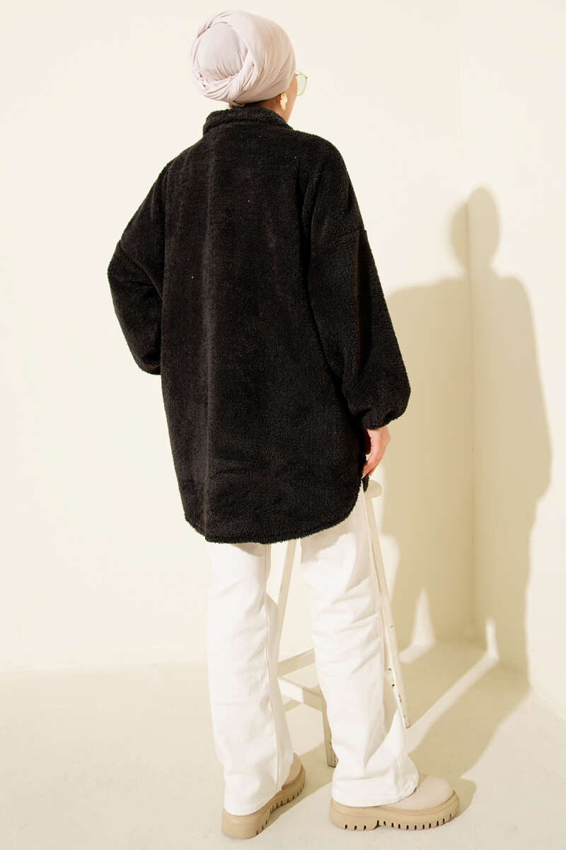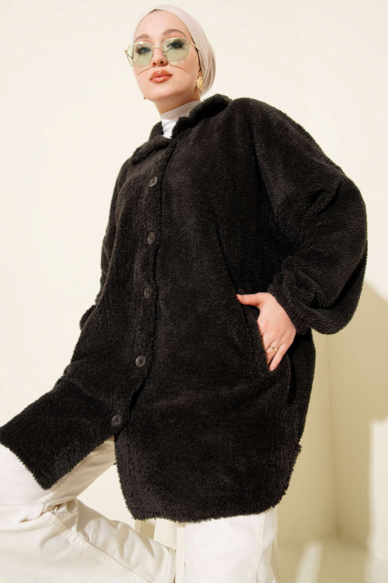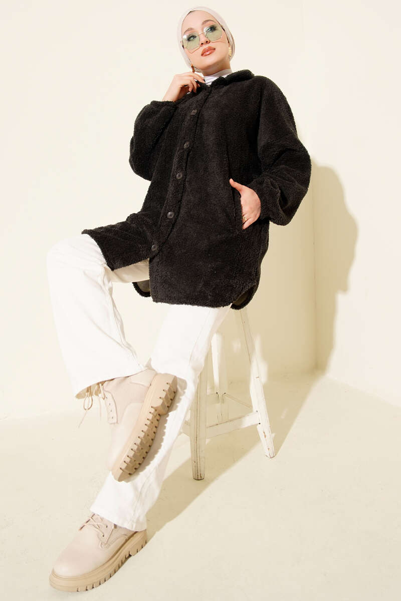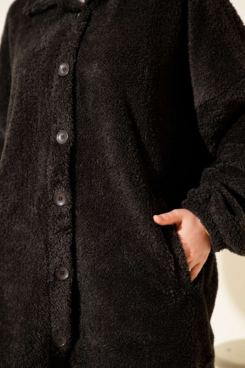 Kol Düğmeli Kaşe Kaban Siyah