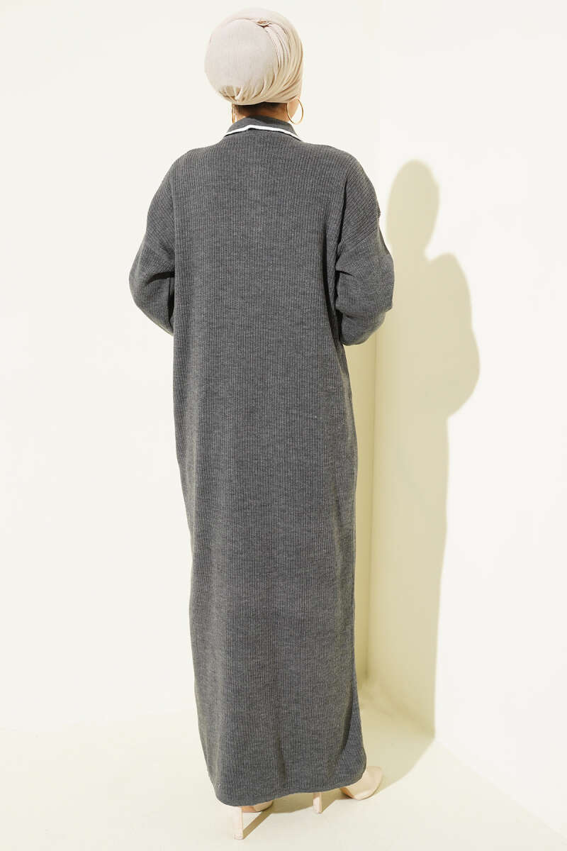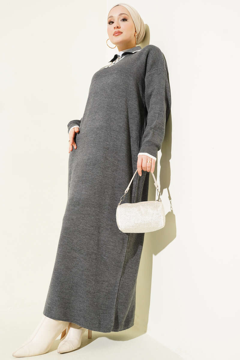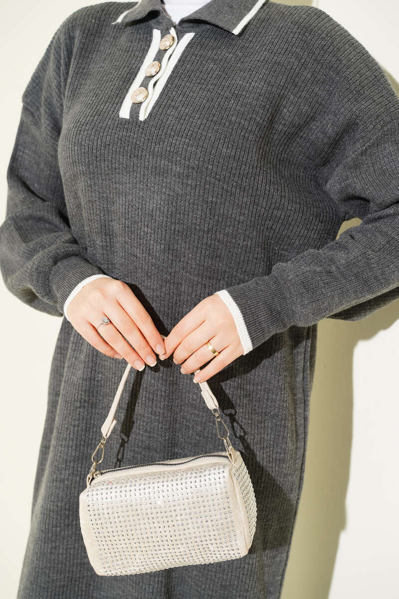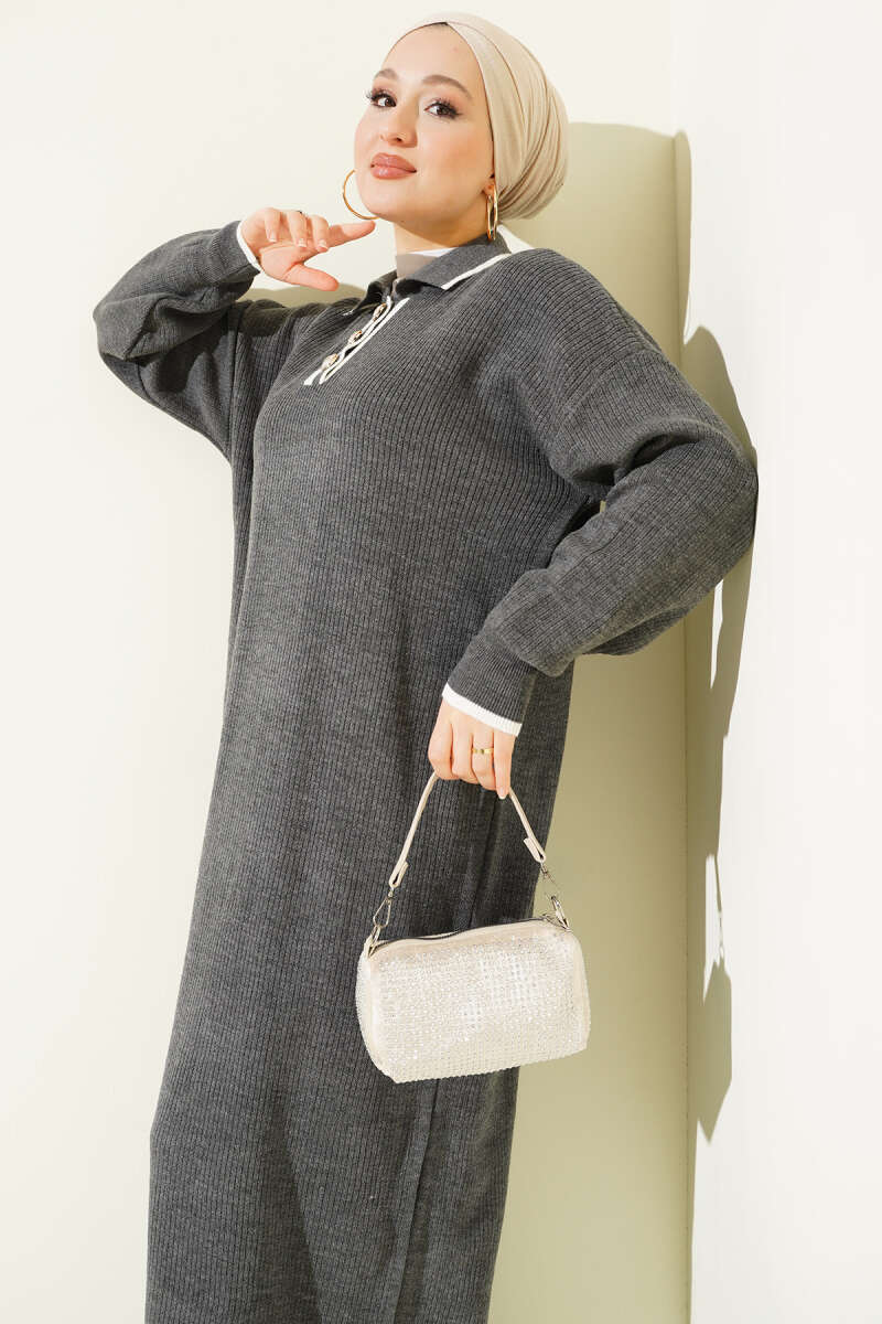 Gömlek Yaka Düğmeli Triko Elbise Taş