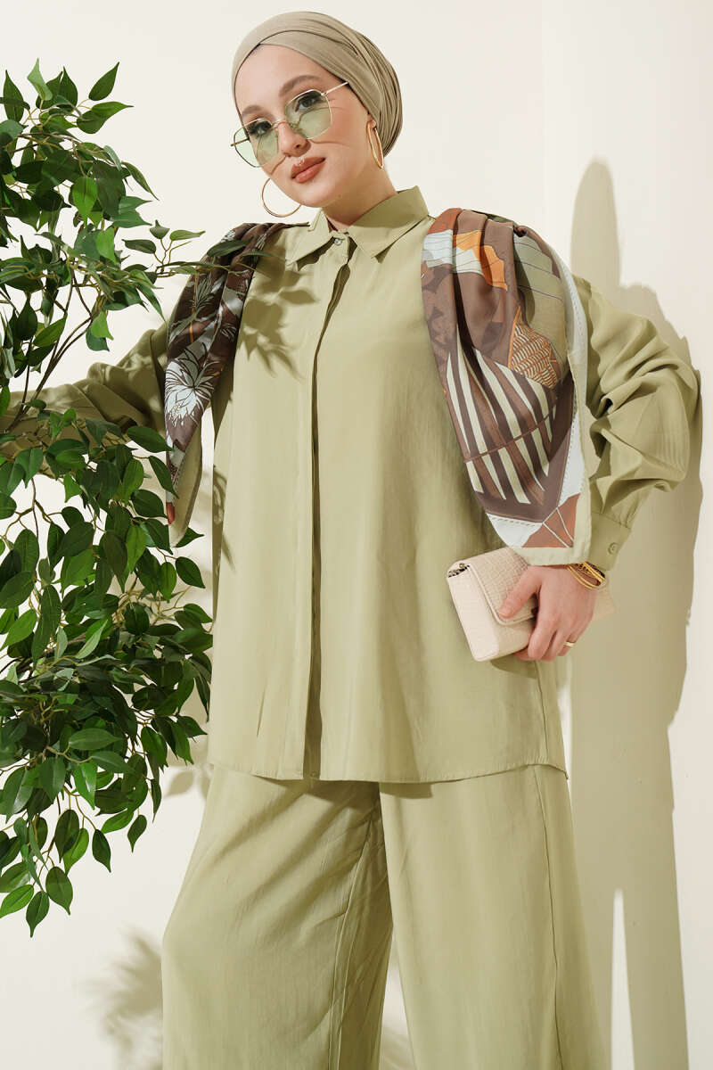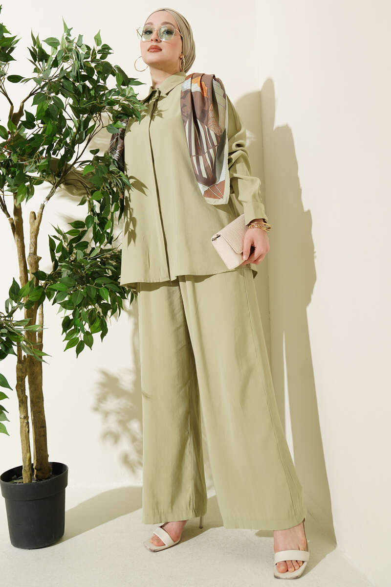 Gömlek Yaka Eşarp Detaylı İkili Takım Çağla Yeşili