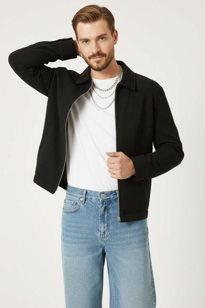 Gömlek Yaka Fermuarlı Erkek Bomber Ceket Siyah