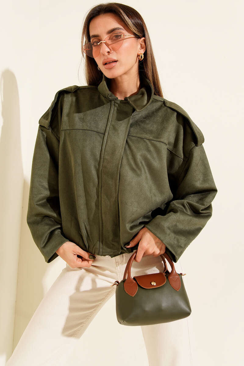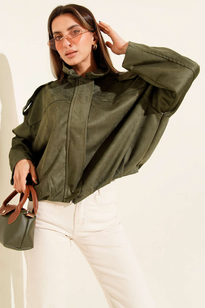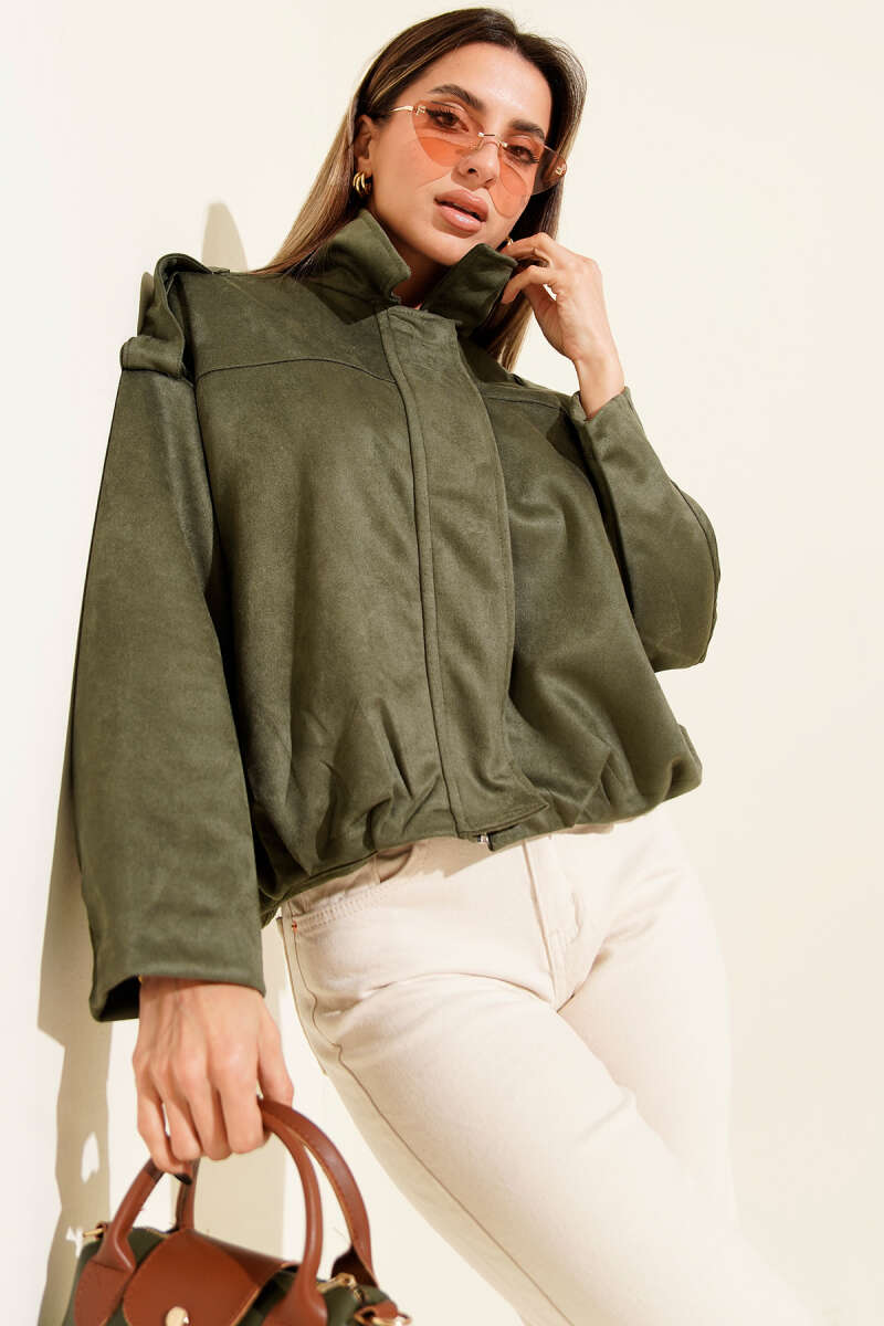 Gömlek Yaka Fermuarlı Süet Ceket Haki