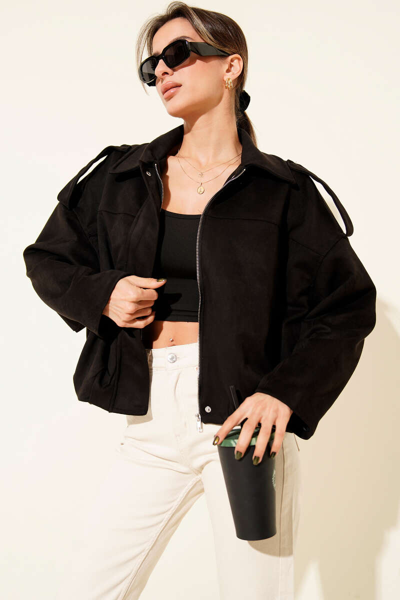 Gömlek Yaka Fermuarlı Süet Ceket Siyah