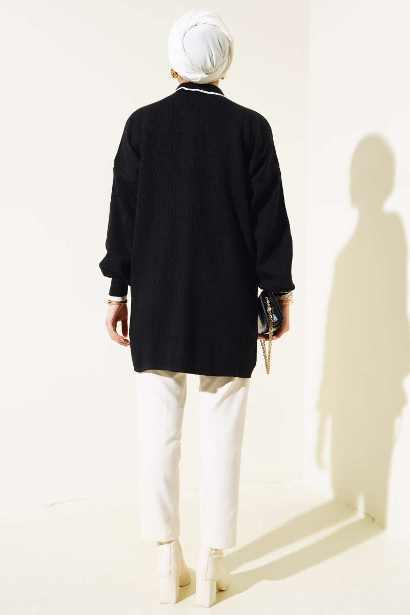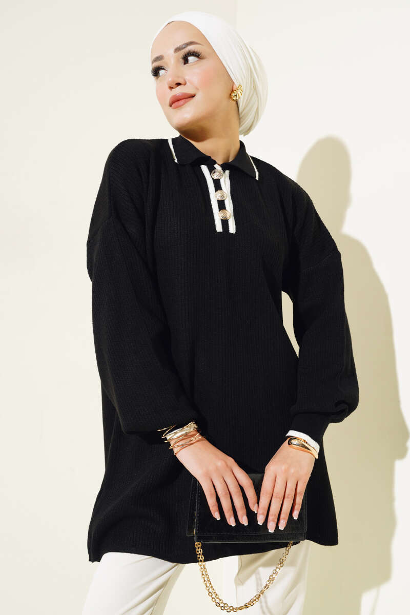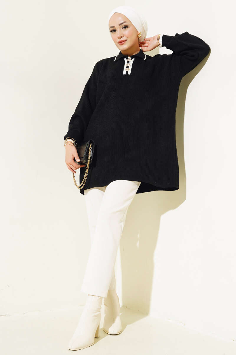 Yatay Çizgi Detaylı Basic Triko Tunik Siyah