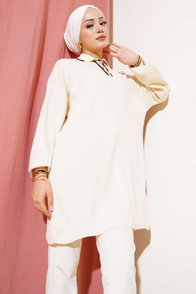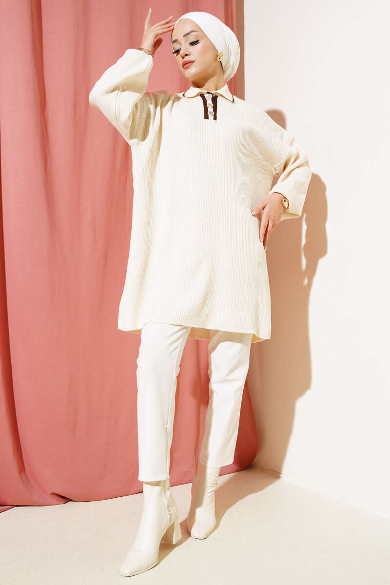 Gömlek Yaka Fitilli Düğmeli Triko Tunik Gül Kurusu