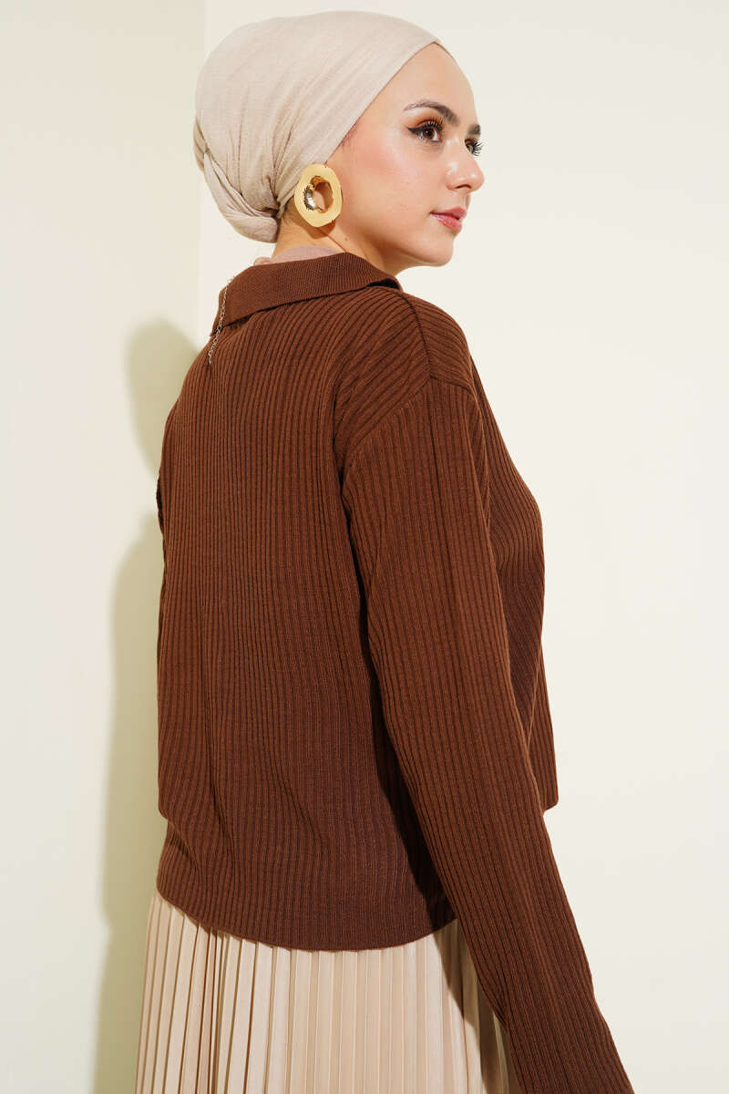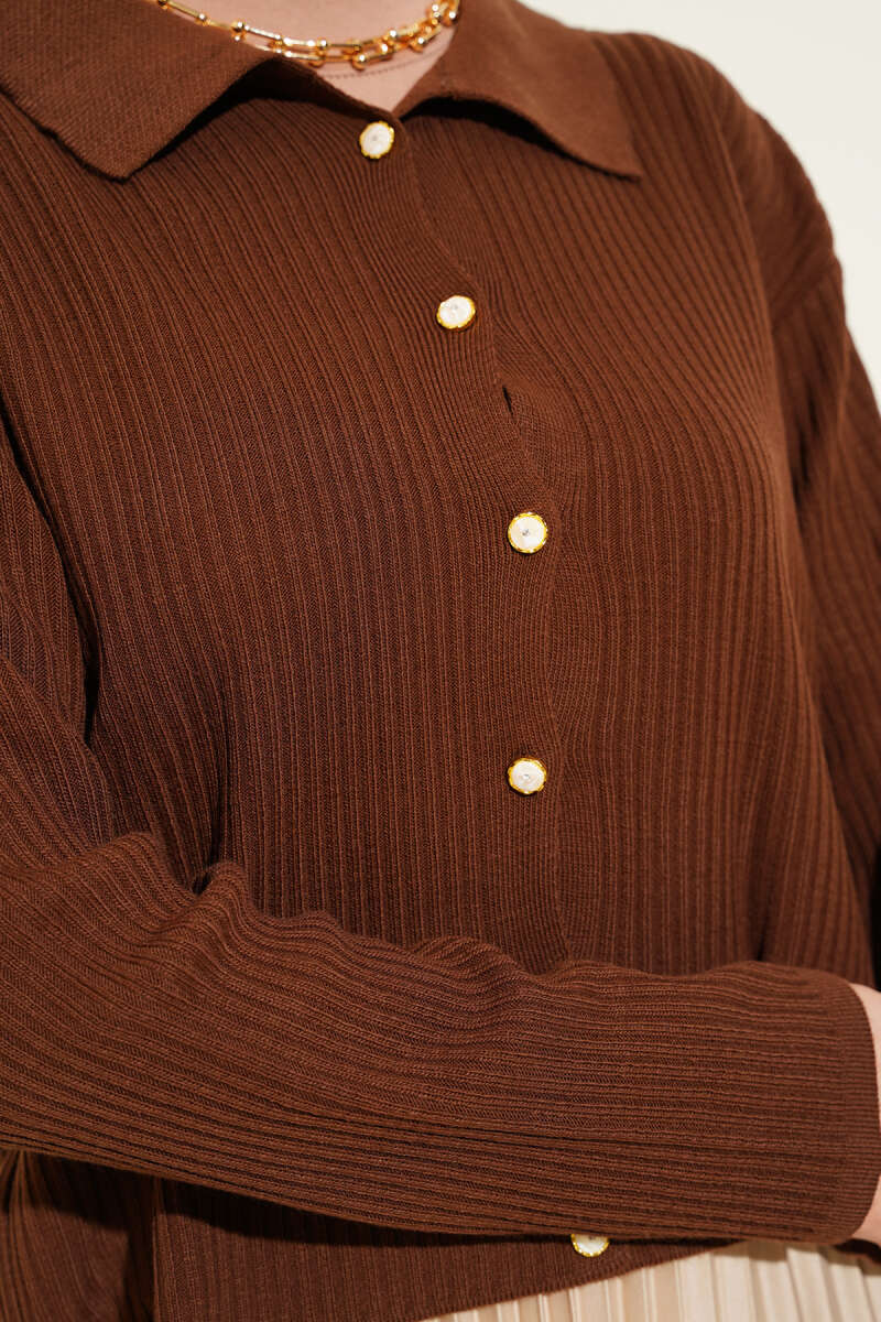 Gold Düğmeli Basic Sakallı Triko Hırka Kahve