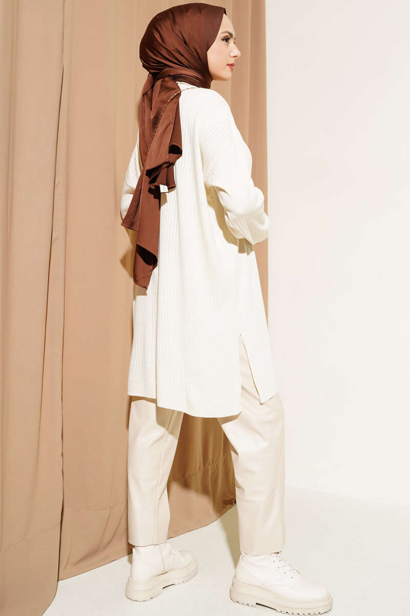 Düğmeli Cepli Uzun Triko Hırka Latte