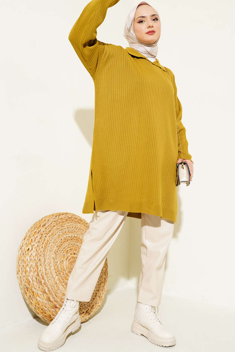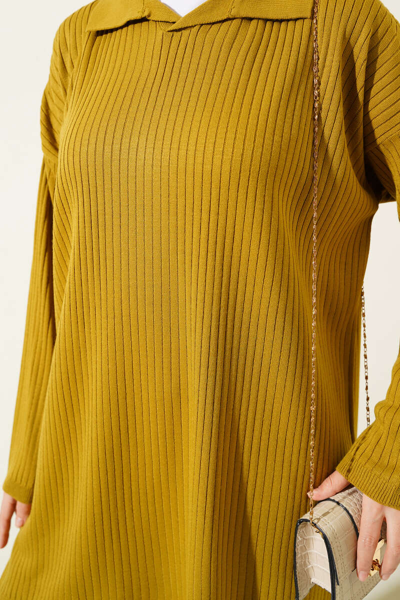 Gömlek Yaka Fiyonklu Triko İkili Takım Bej
