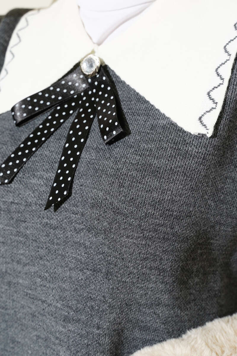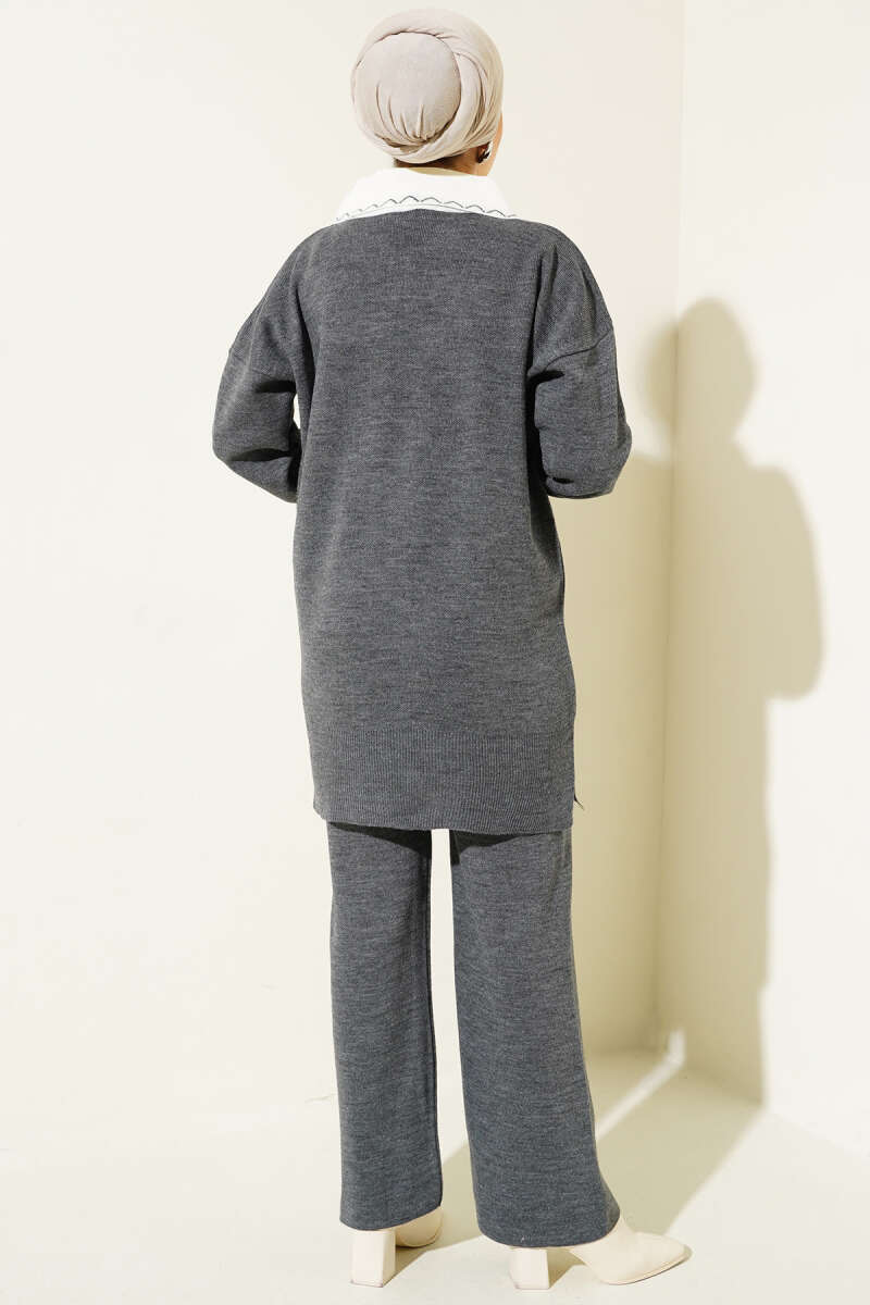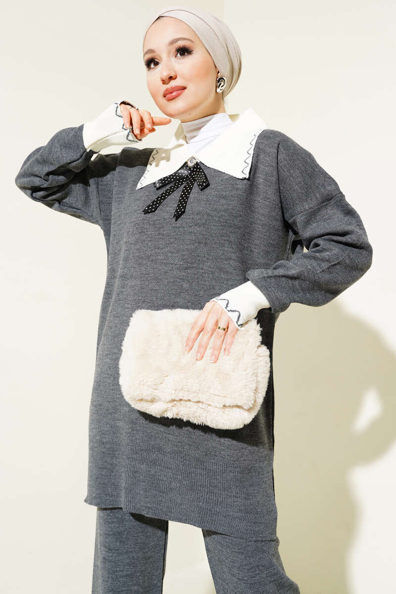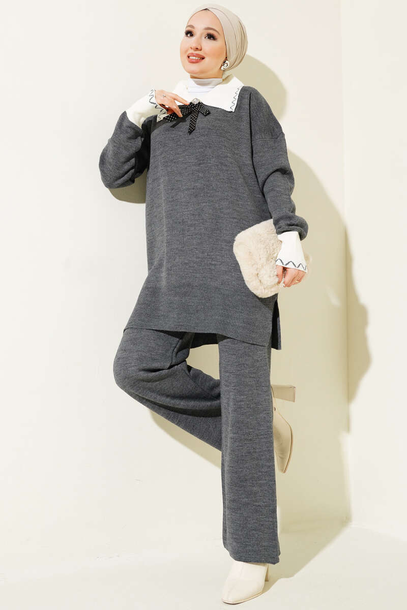 Gömlek Yaka Fiyonklu Triko İkili Takım Saks