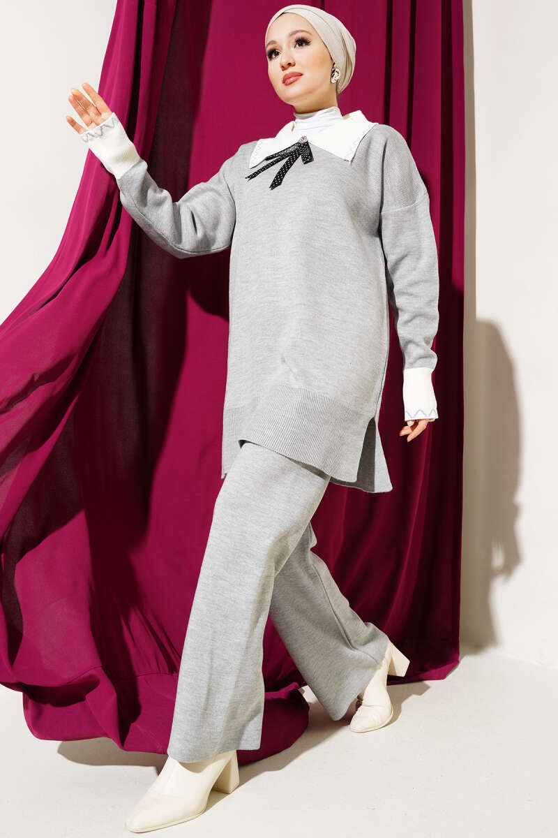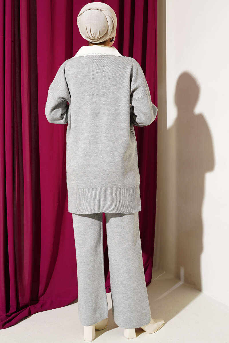 Balıkçı Yaka Fitilli Kuşaklı İkili Takım Gri