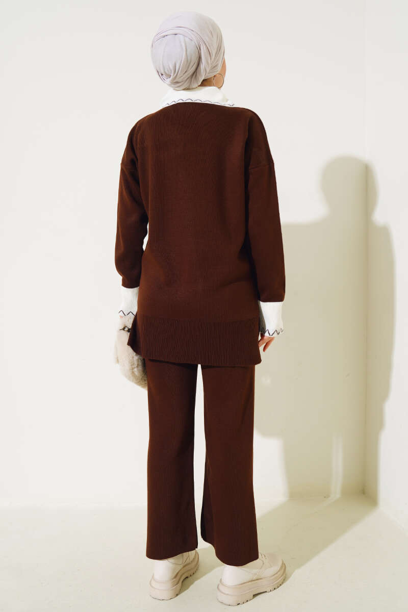 Balıkçı Yaka Fitilli Triko İkili Takım Kahve