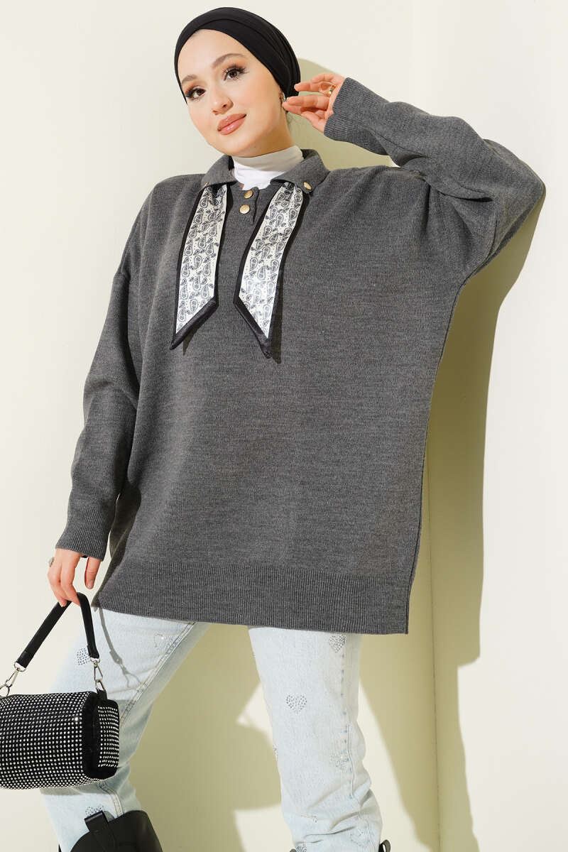 Gömlek Yaka Fularlı Triko Tunik Taş