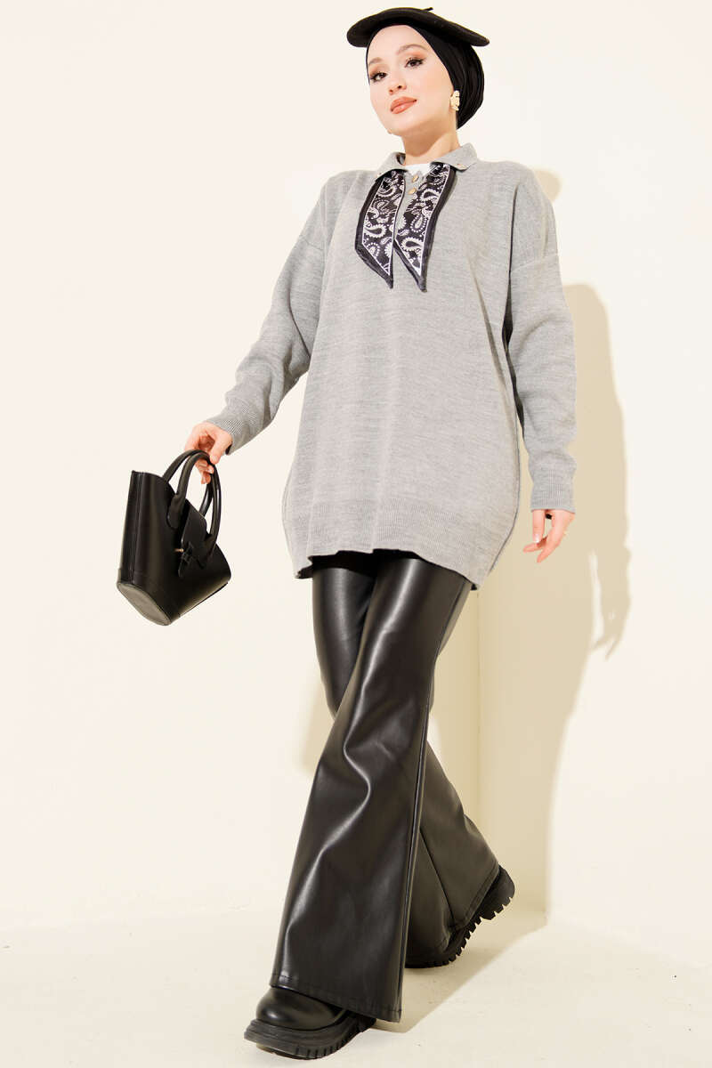 Gömlek Yaka Fularlı Triko Tunik Gri