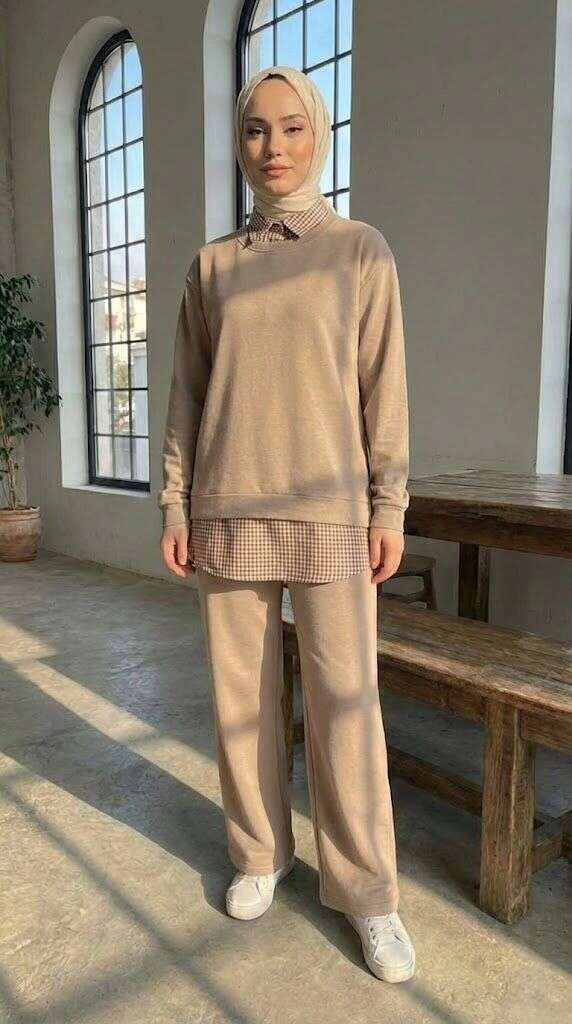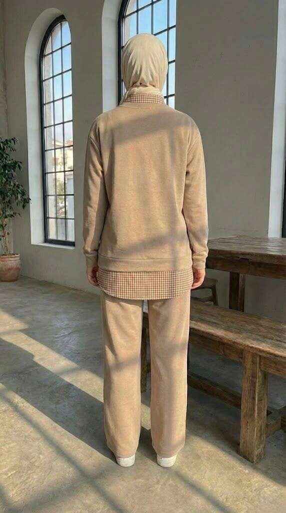 Gömlek Yaka Garnili İkili Takım Bej