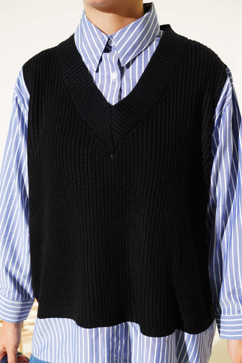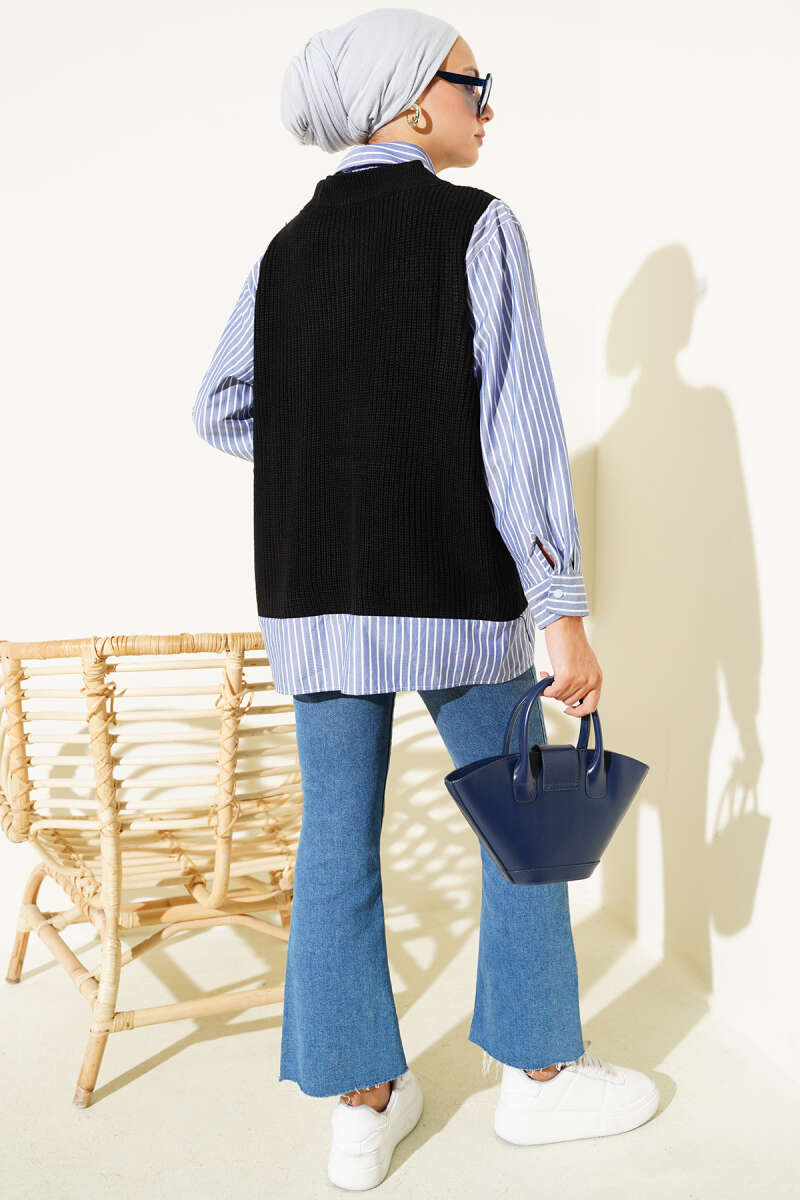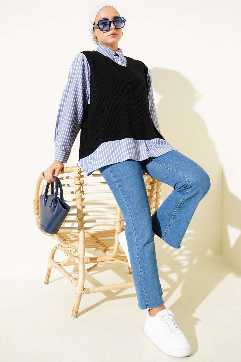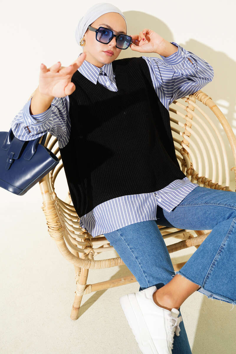 Gömlek Yaka Garnili Süveter Siyah Lacivert