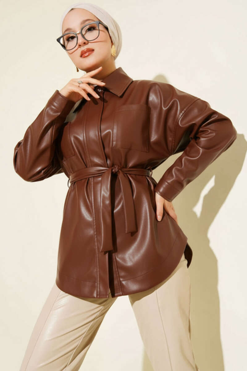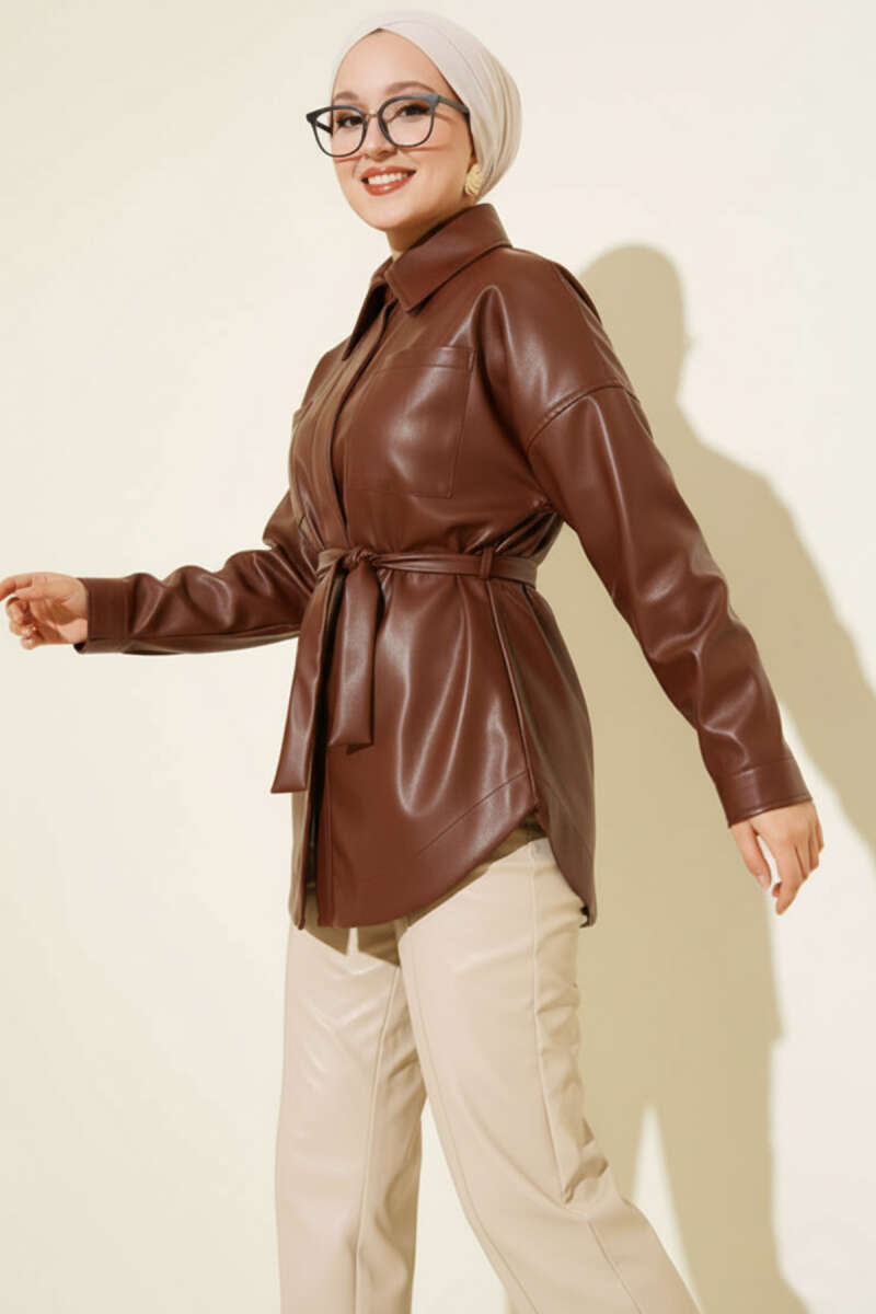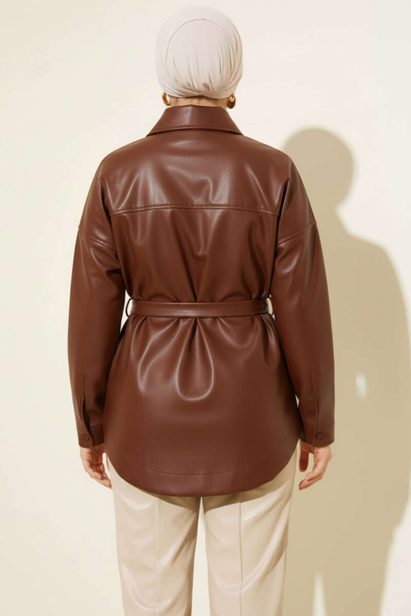 Deri Çıtçıtlı Sakallı Kuşaklı Ceket Kahve