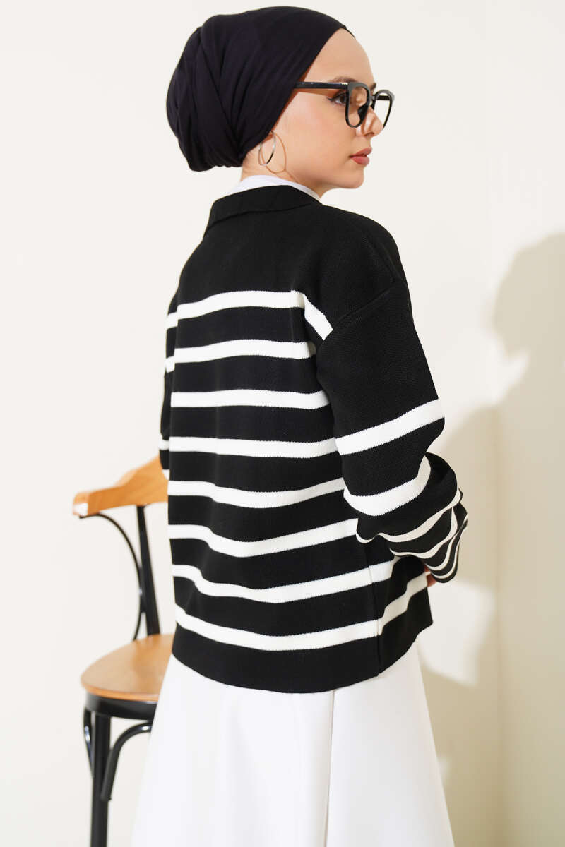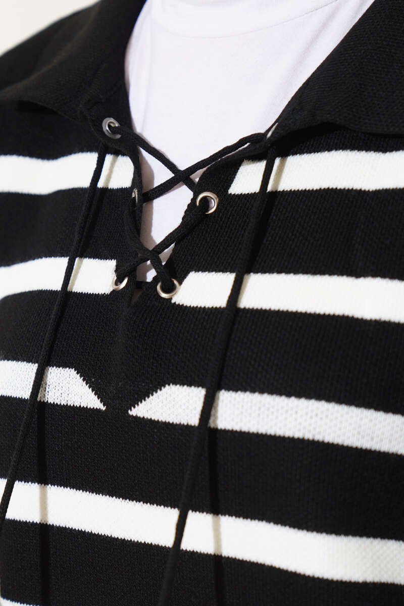 Gömlek Yaka İpli Çizgili Kazak Siyah
