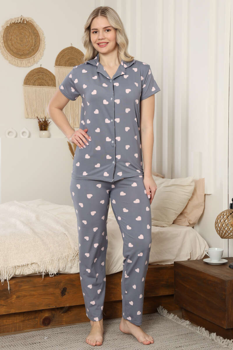 Gömlek Yaka Kalp Desenli Pijama Takımı Gri