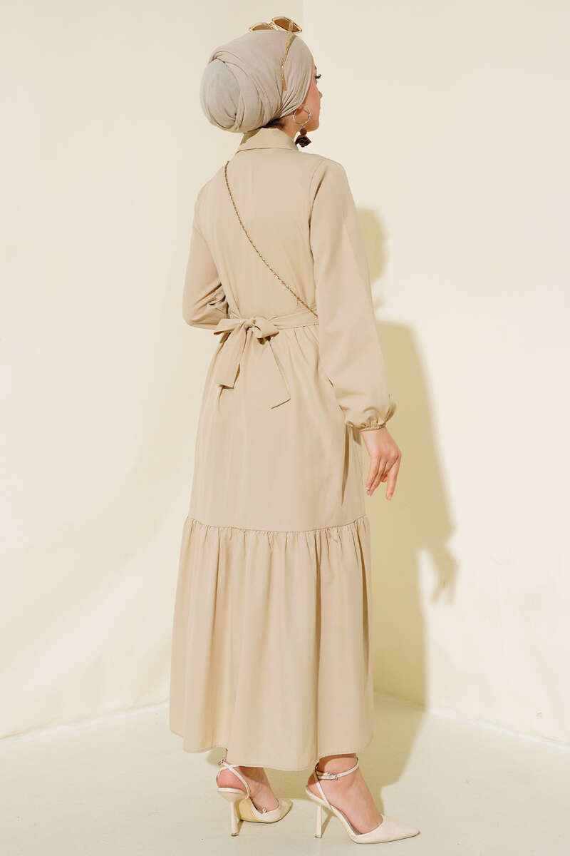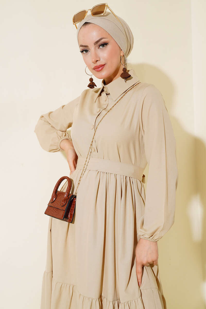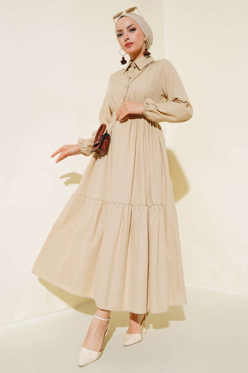 Gömlek Yaka Kat Elbise Bej