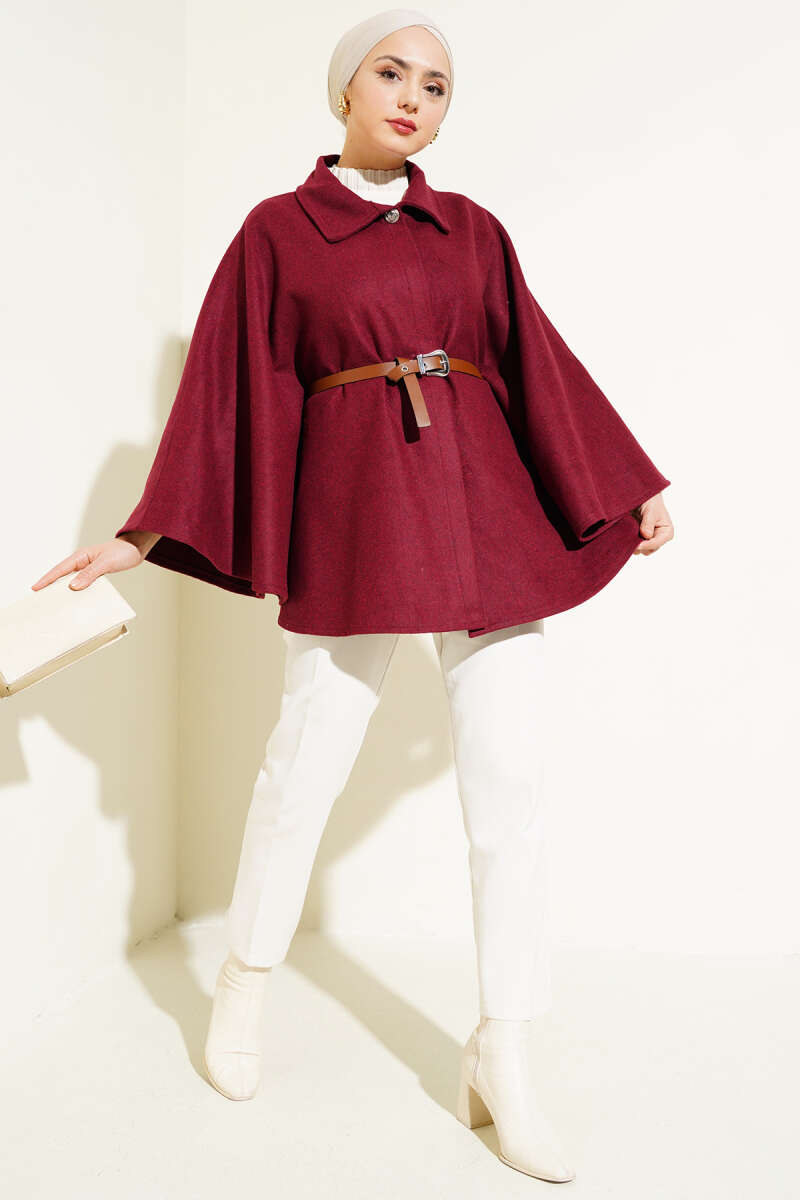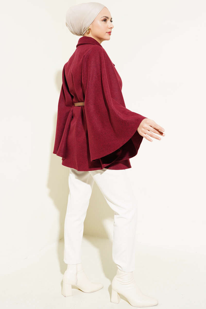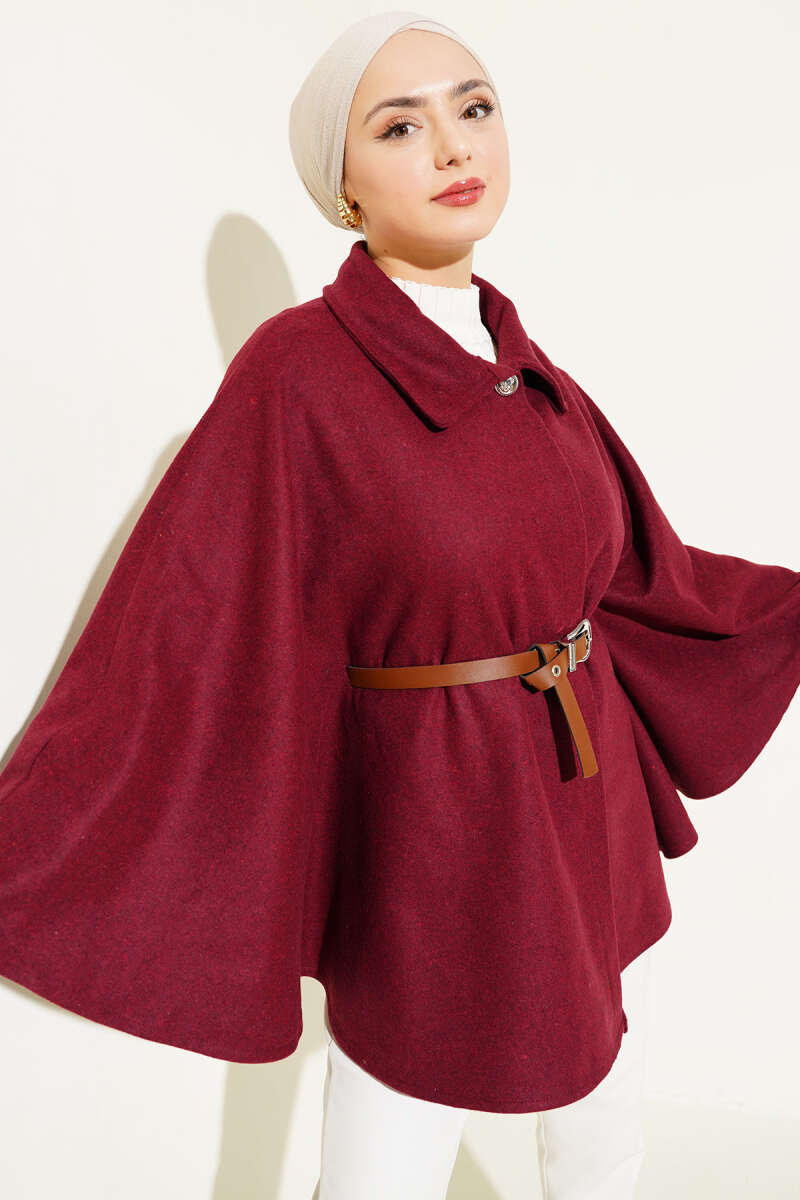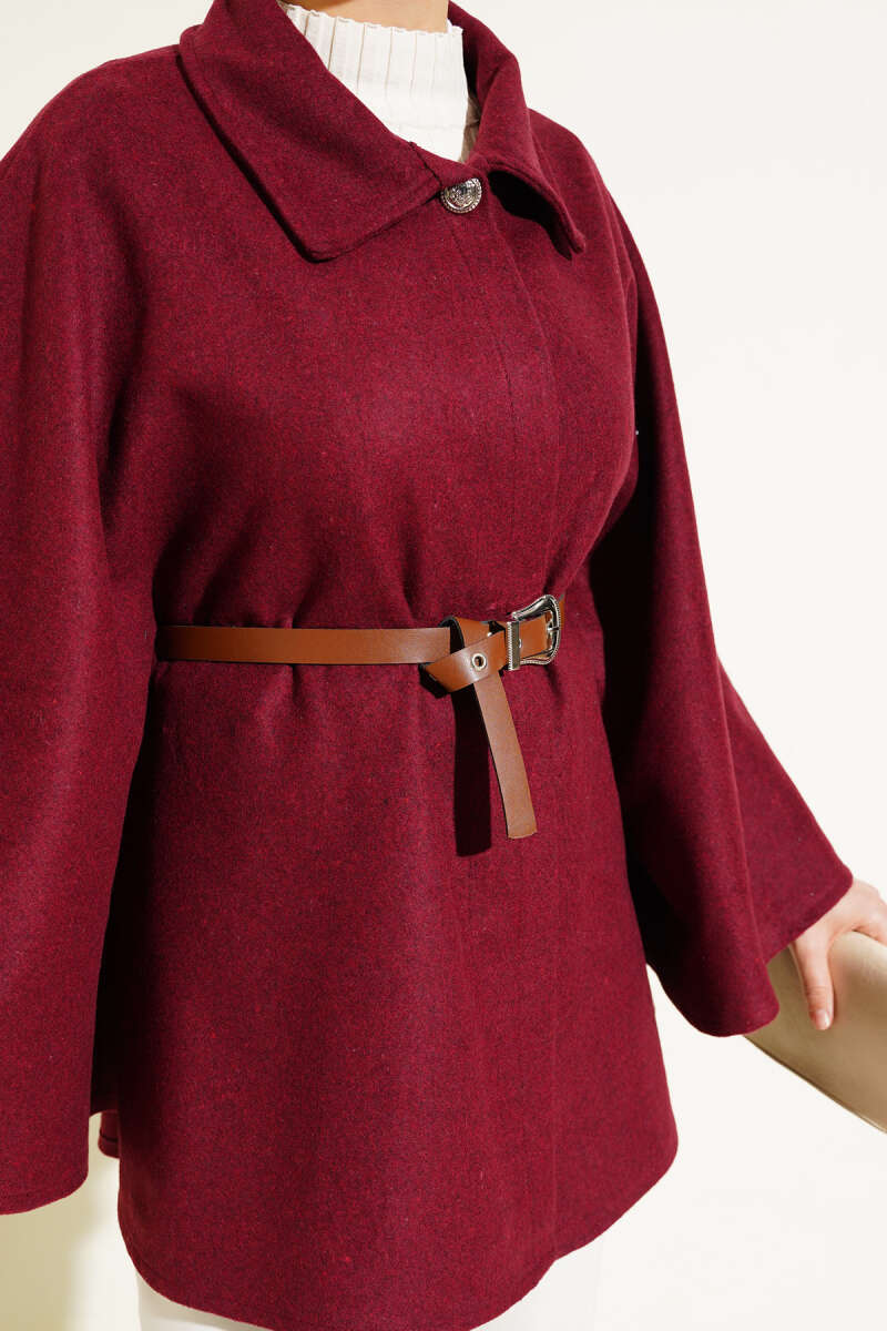 Gömlek Yaka Kemerli Kaşe Panço Bordo