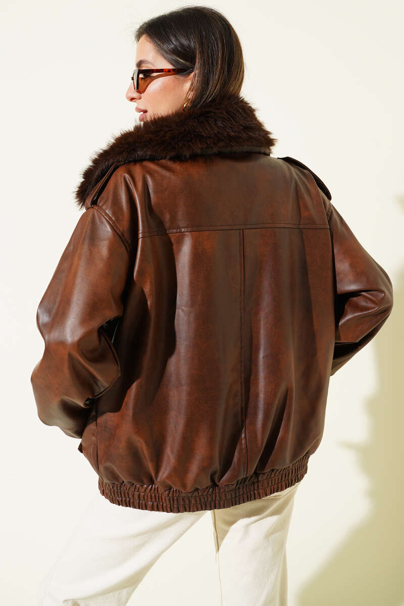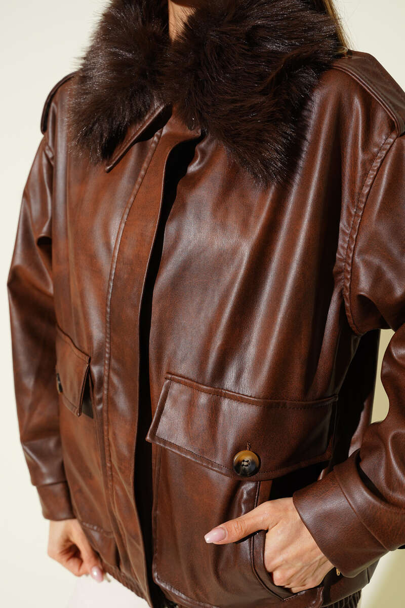 Gömlek Yaka Kürklü Deri Mont Kahve