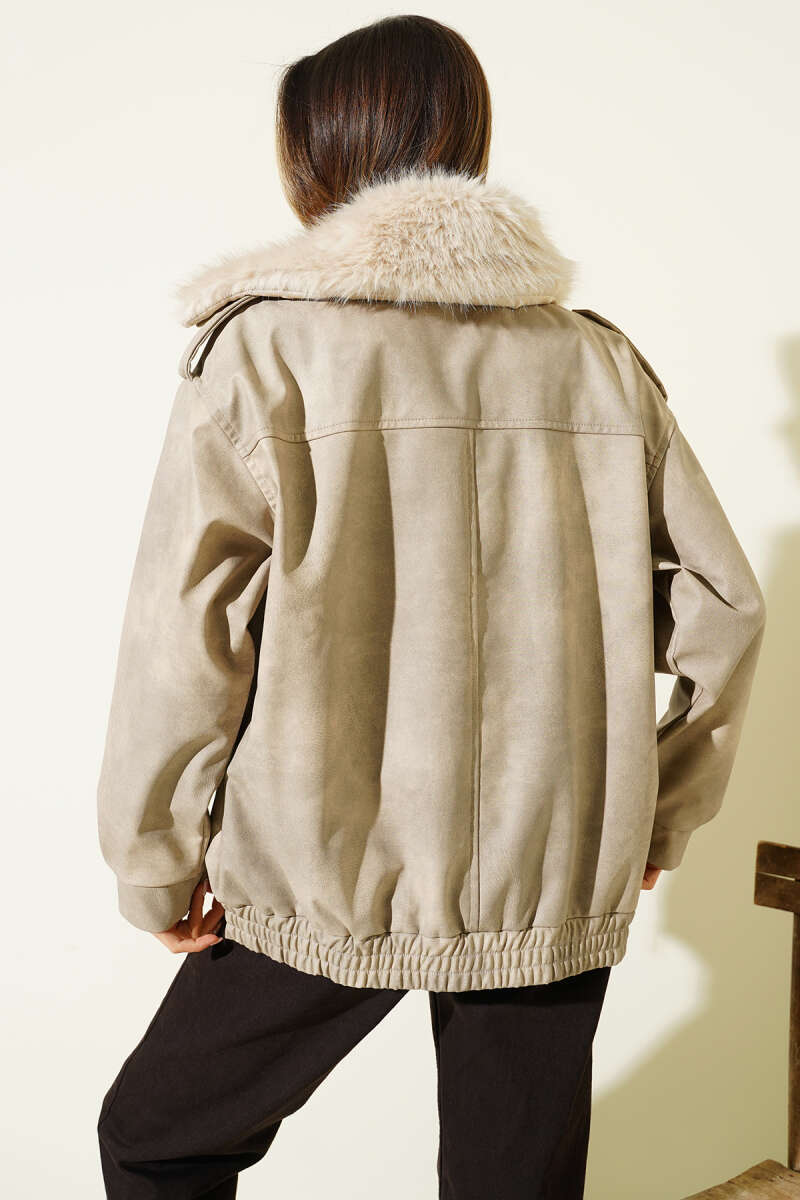 Gömlek Yaka Kürklü Deri Mont Taş