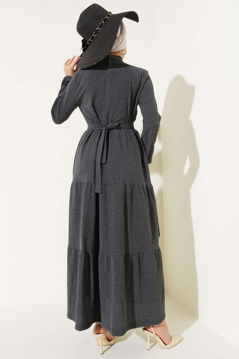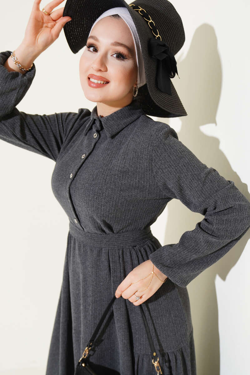 Çizgi Gömlek Garnili Triko Elbise Füme