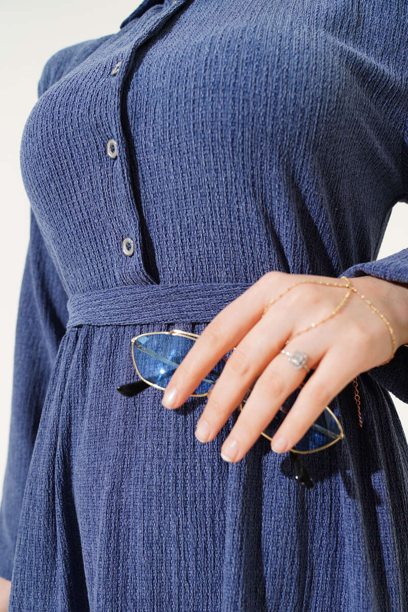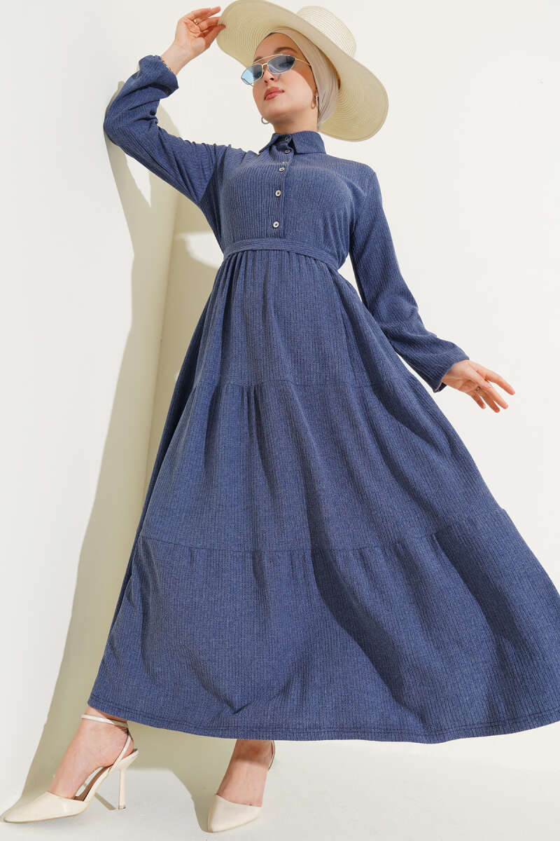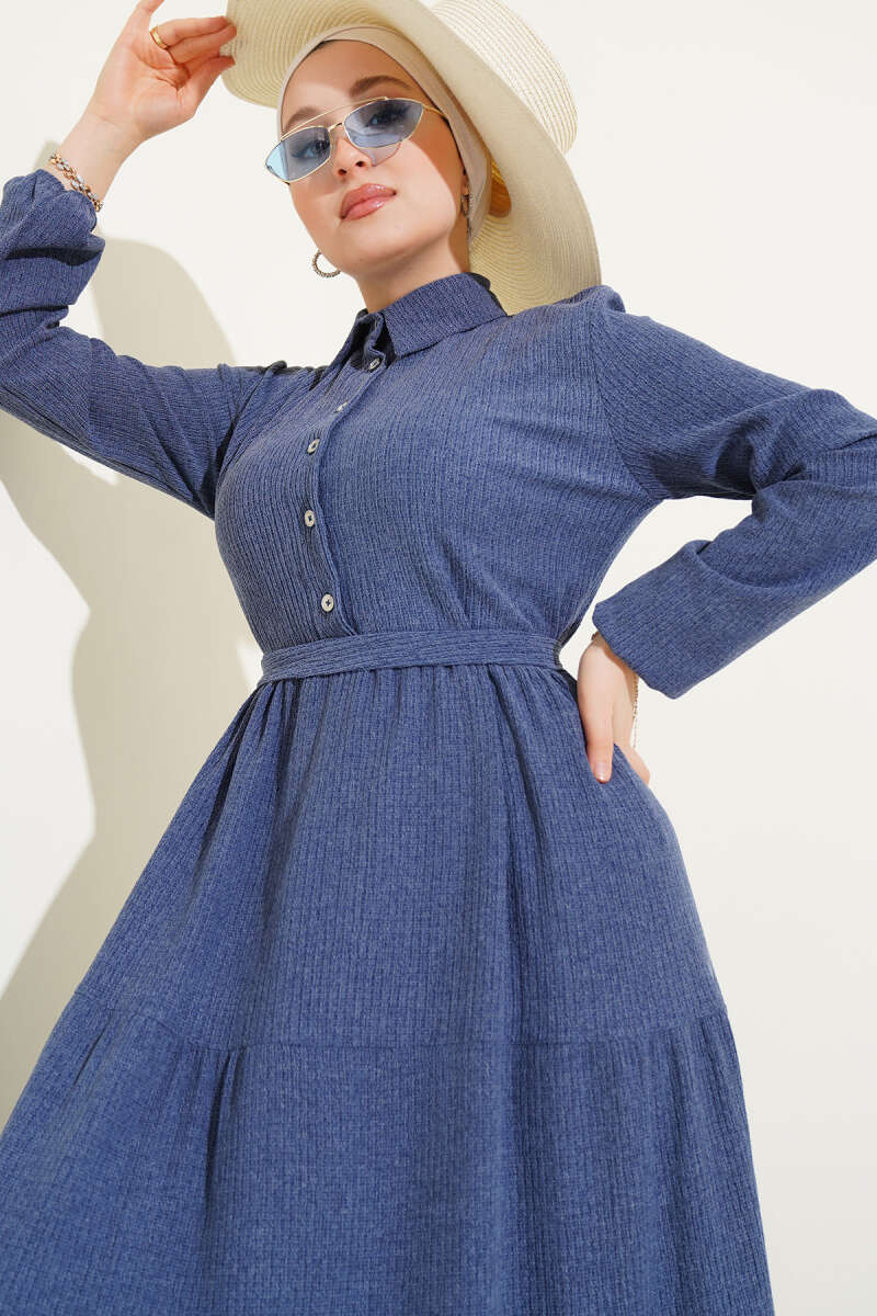 Çizgi Gömlek Garnili Triko Elbise Füme