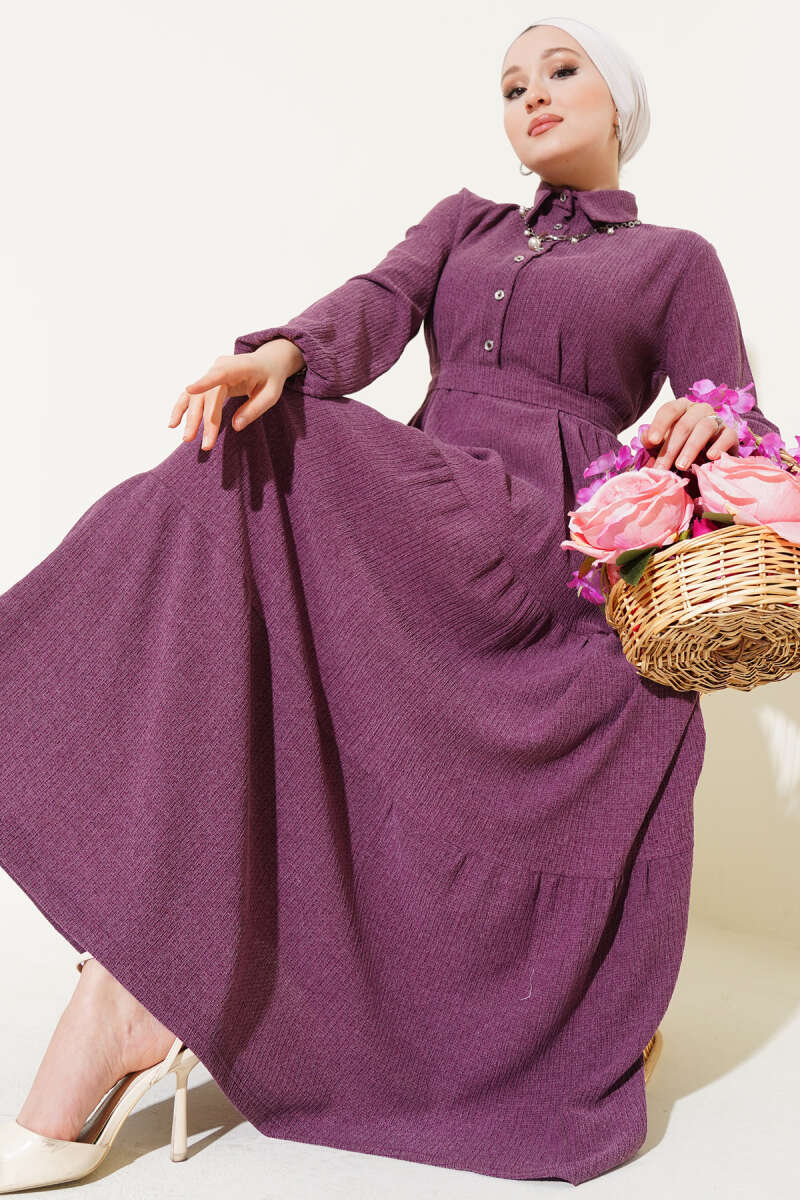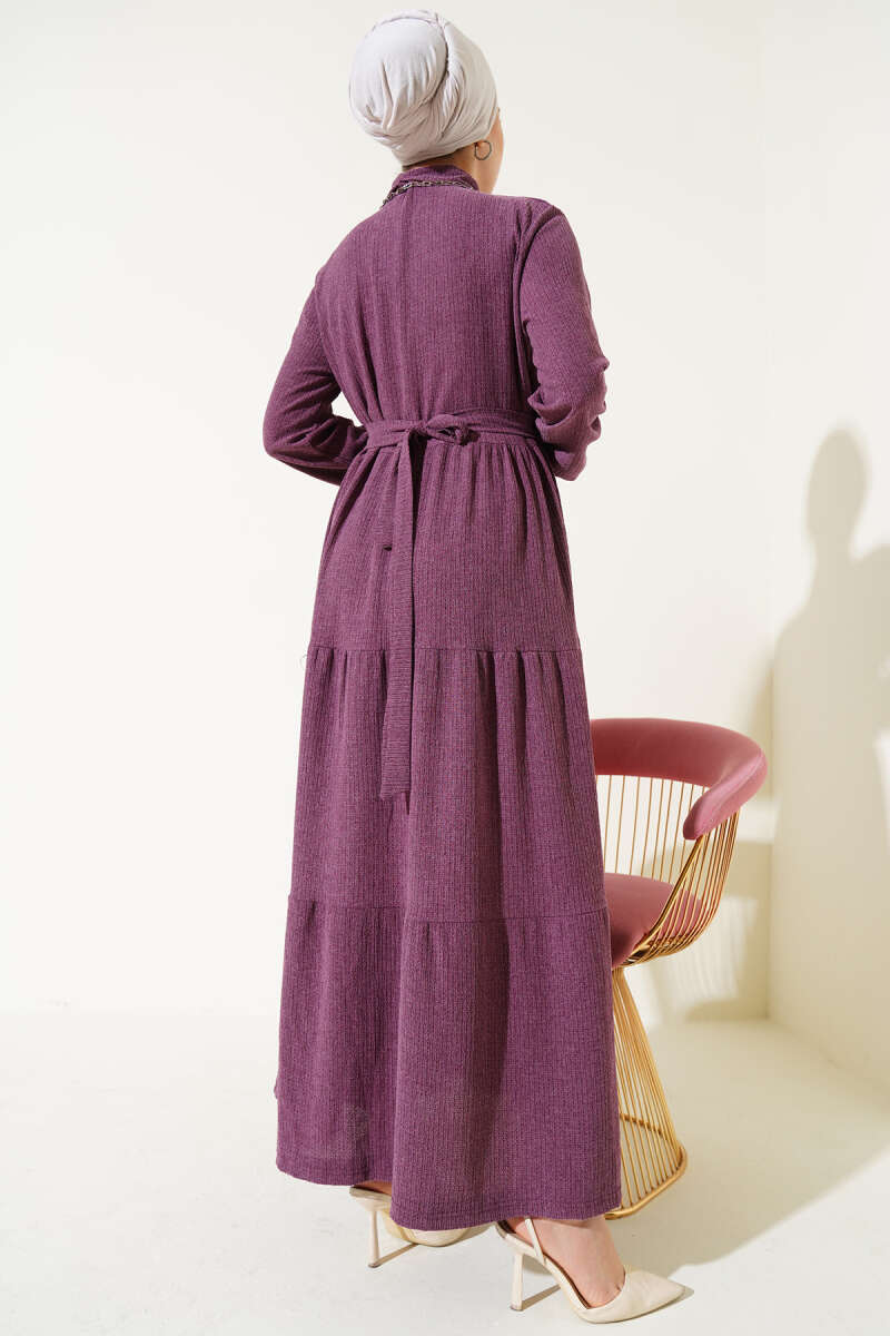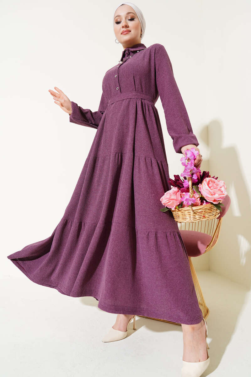 Çizgi Gömlek Garnili Triko Elbise Bordo