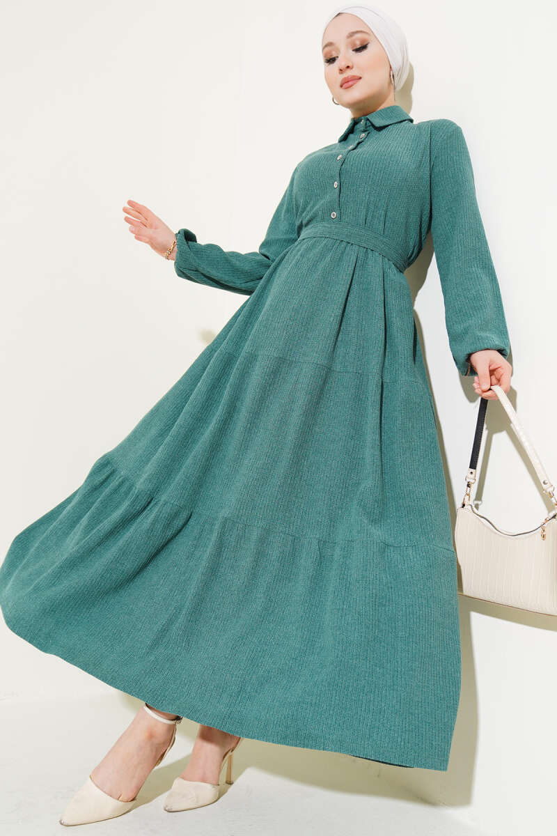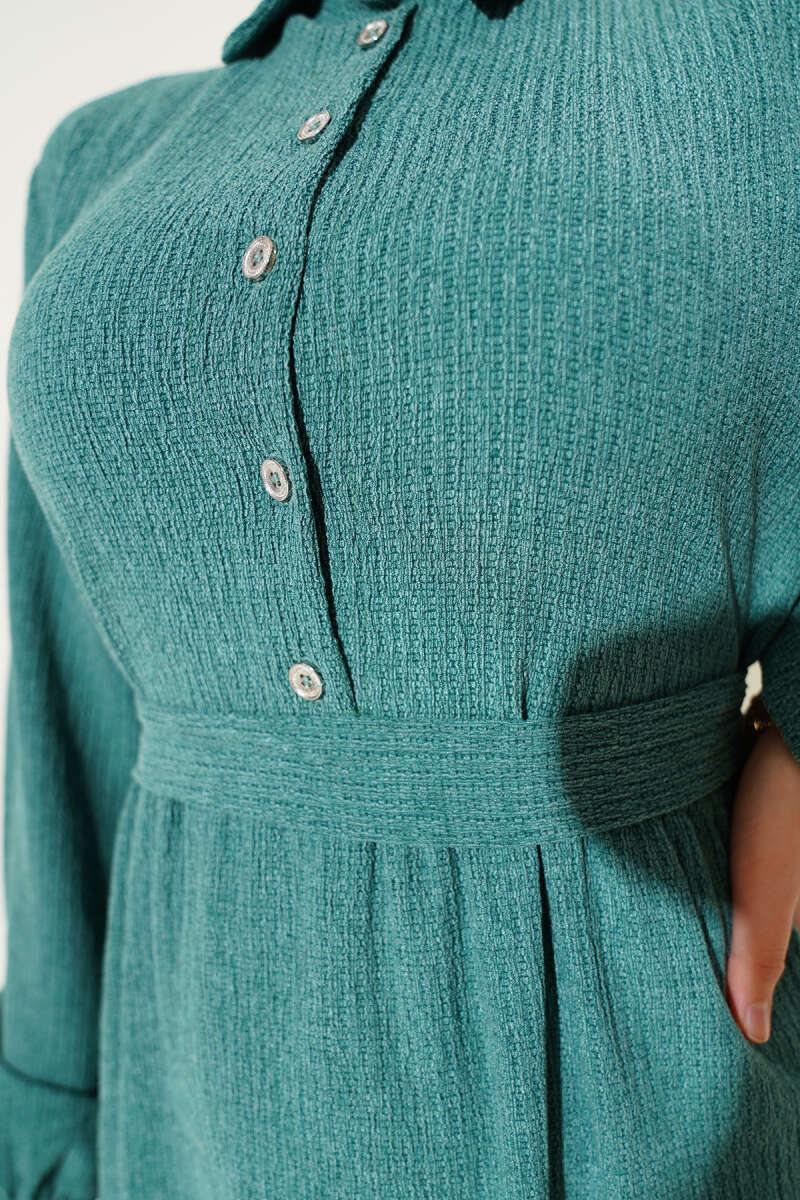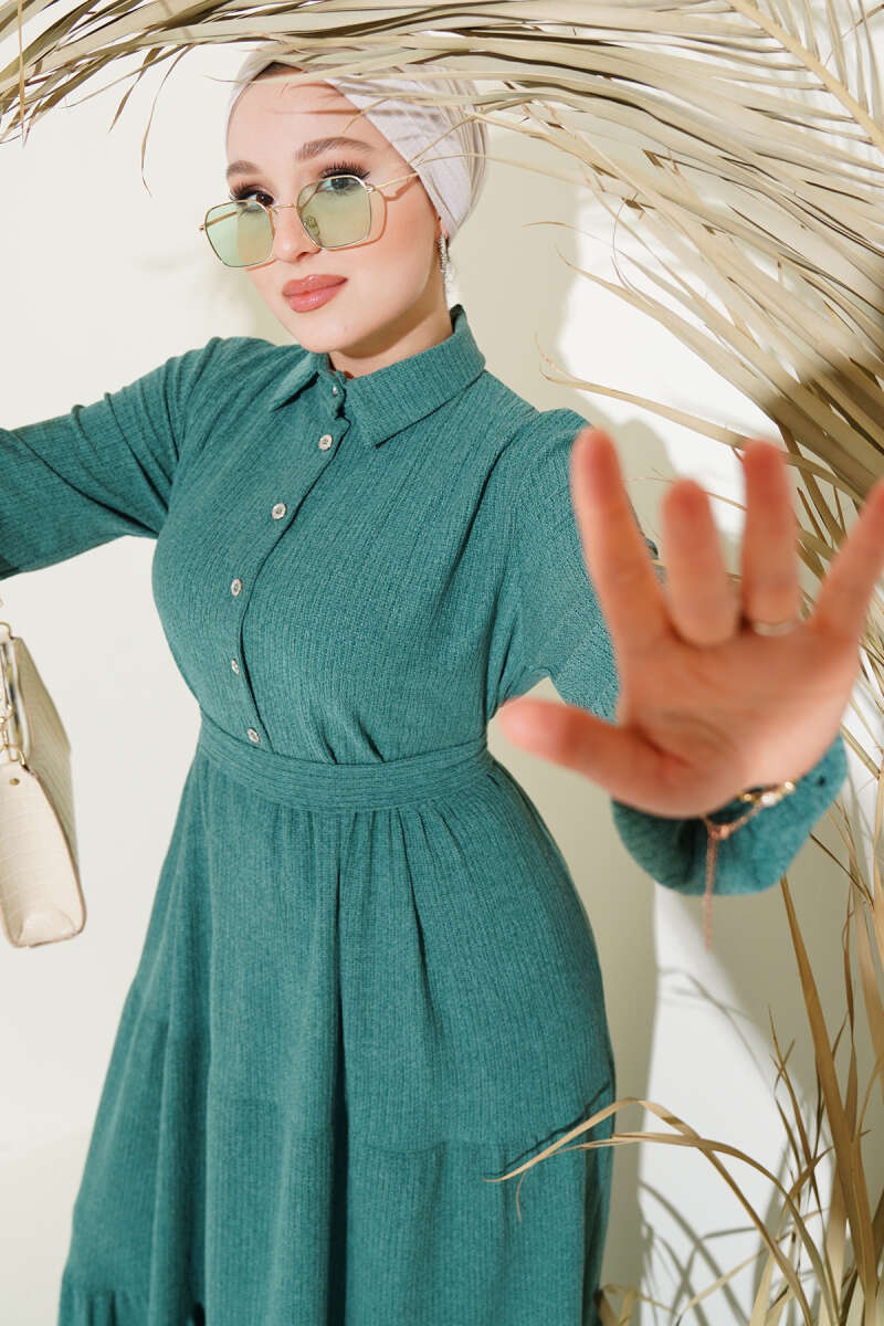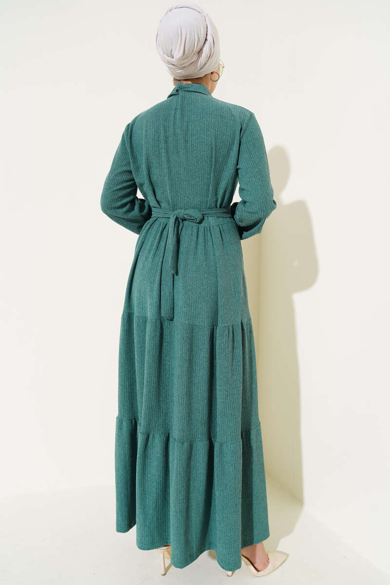 Şerit Ajur Desen Triko Elbise Zümrüt Yeşili