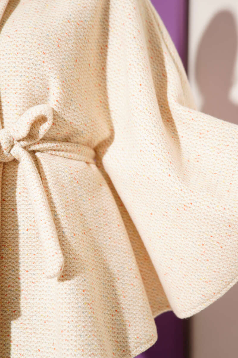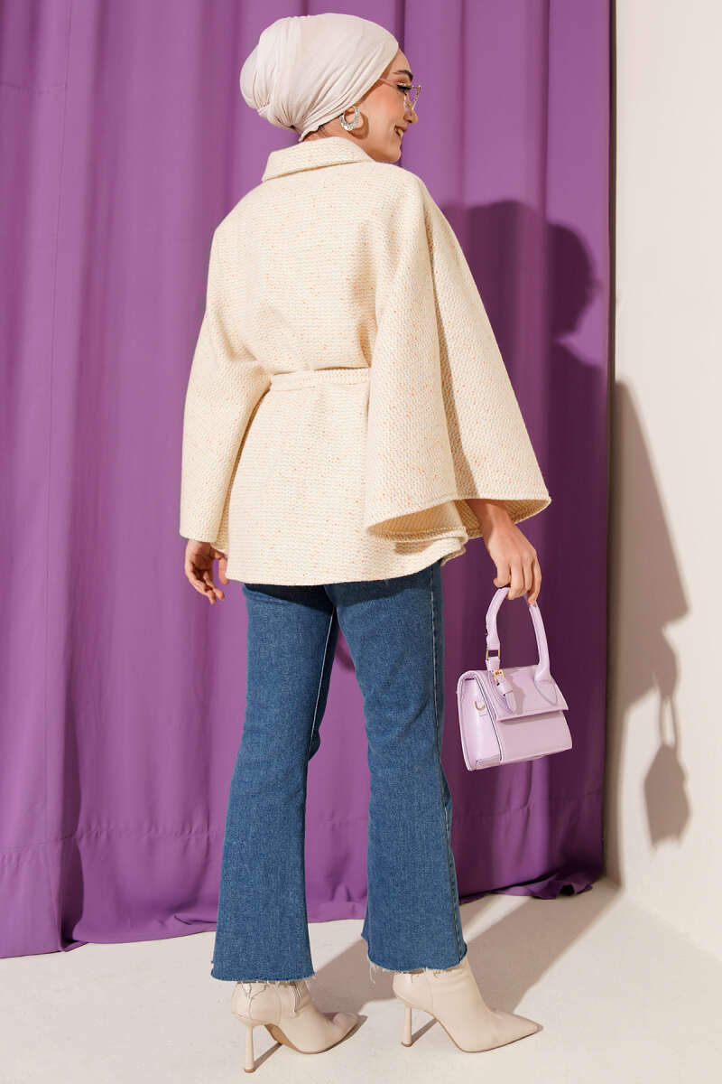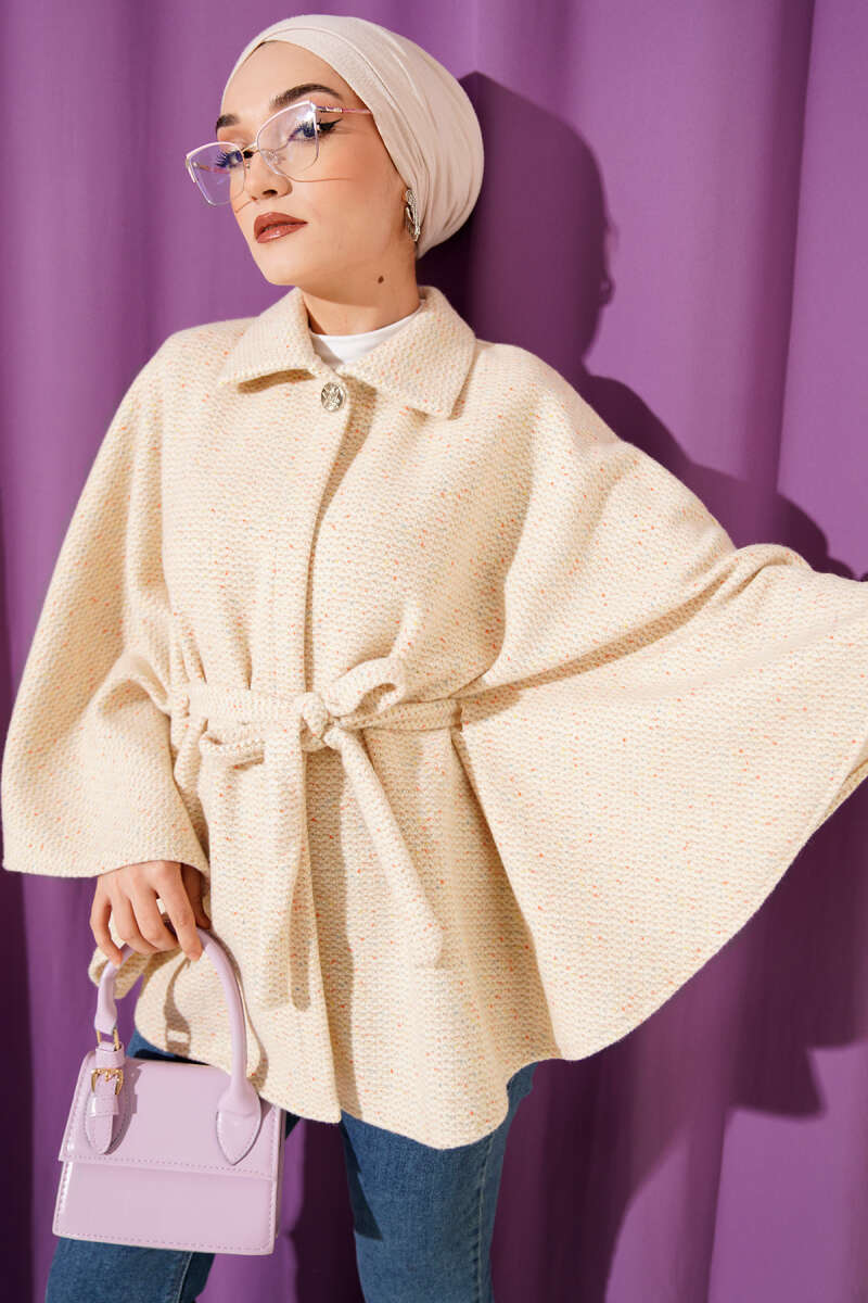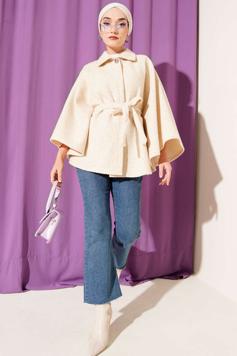 Gömlek Yaka Kuşaklı Kaşe Panço Bej