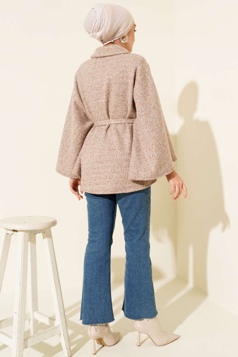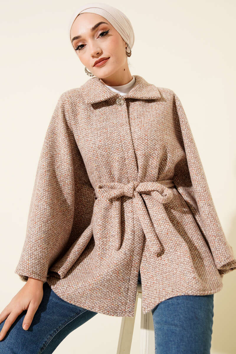 Gömlek Yaka Kuşaklı Kaşe Panço Bej