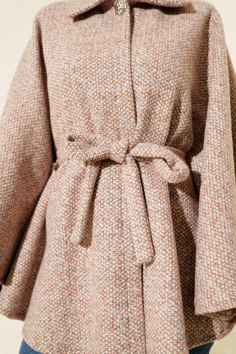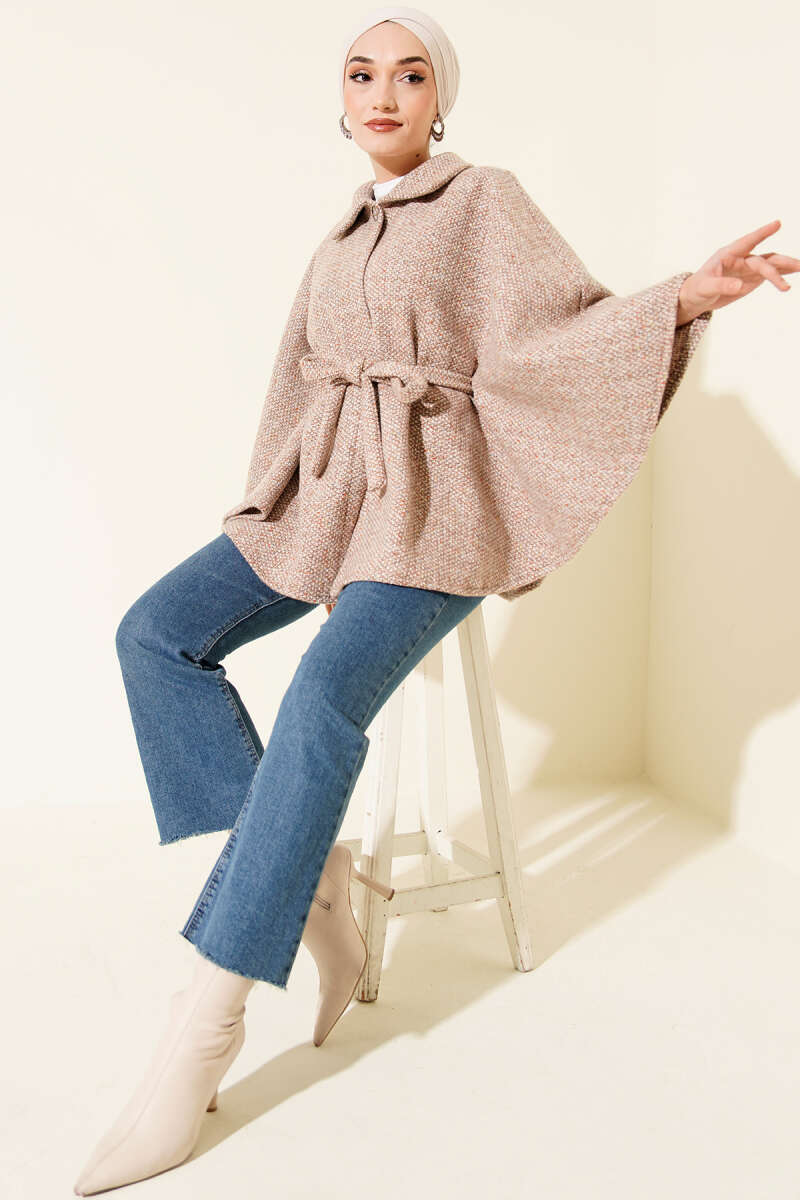 Gömlek Yaka Kuşaklı Kaşe Panço Vizon