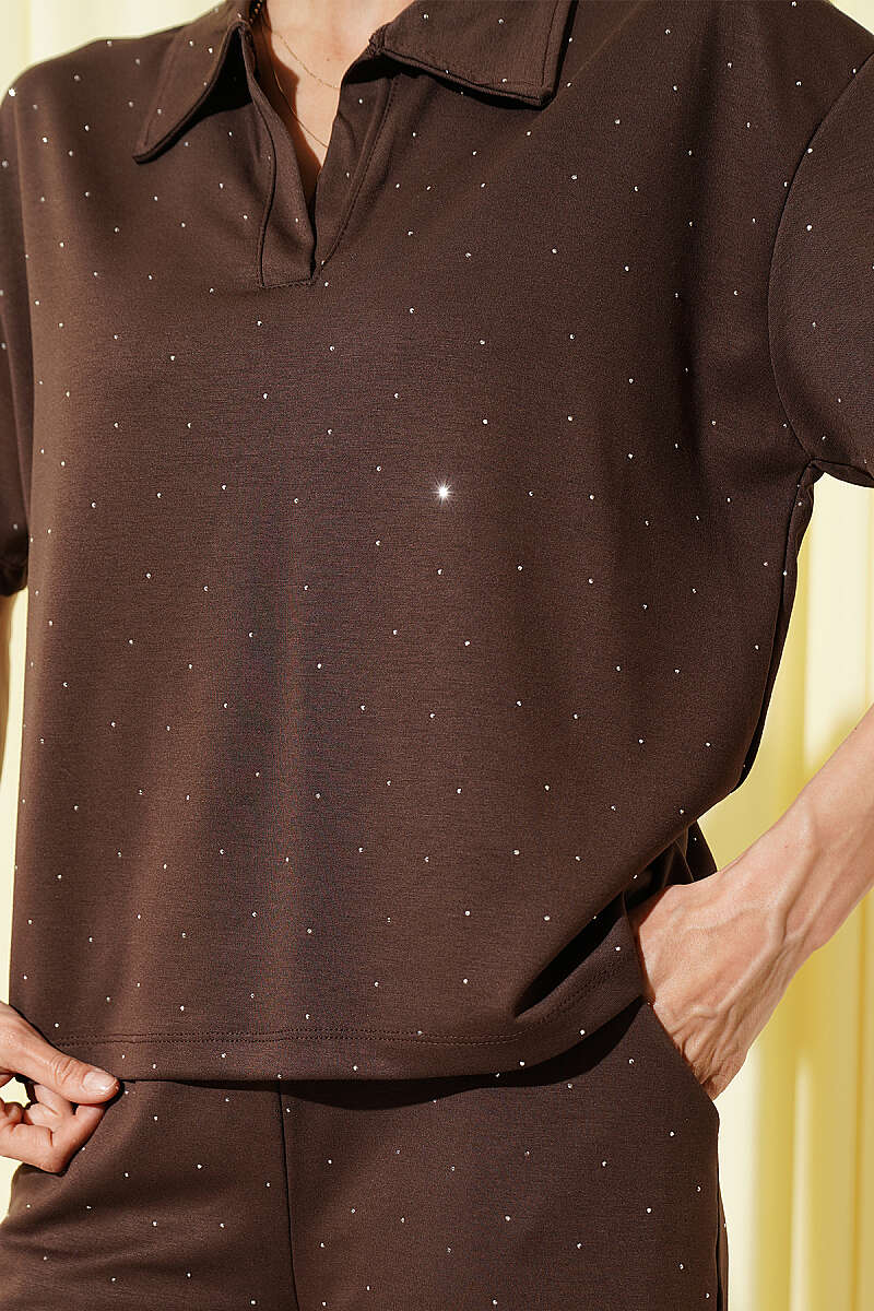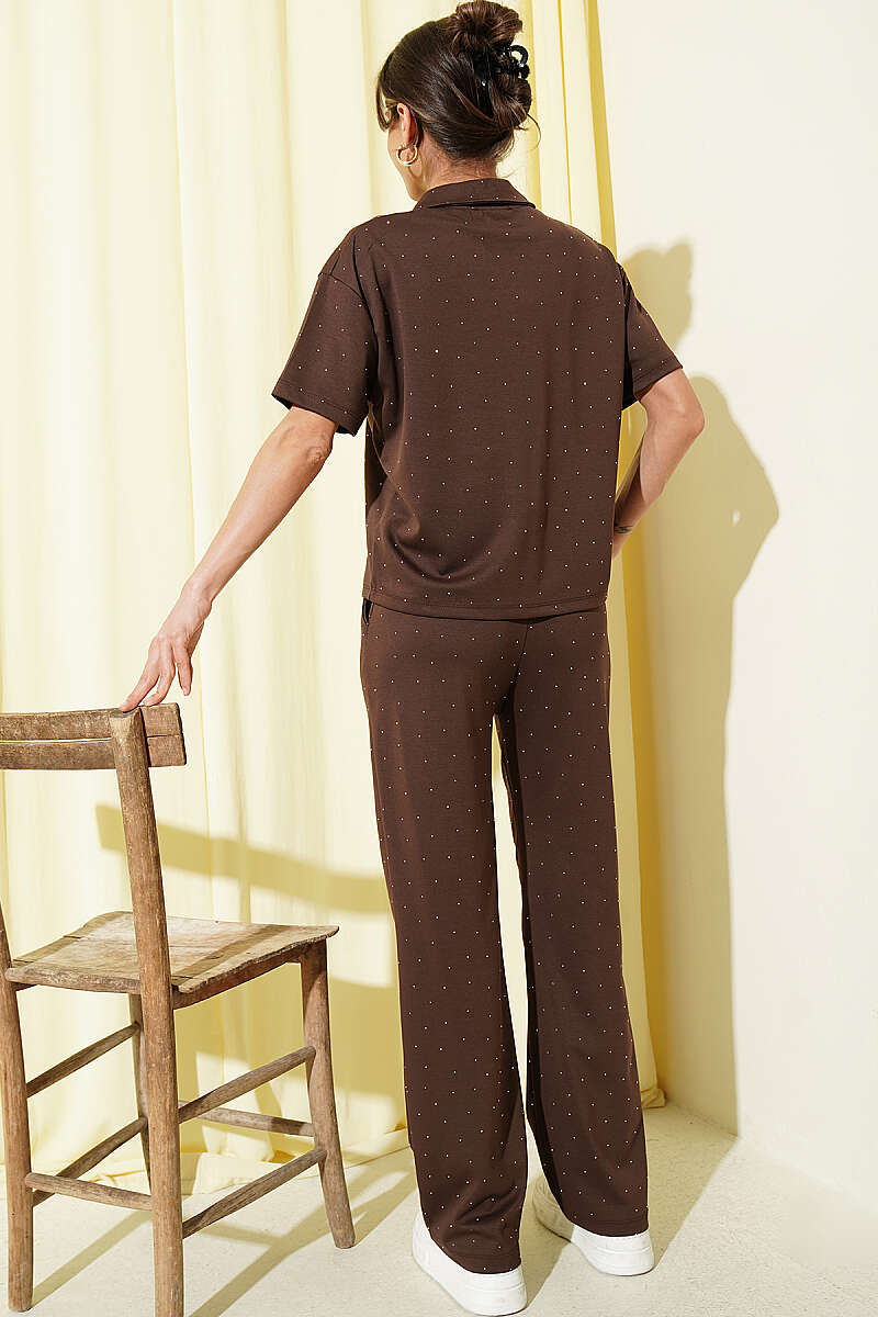 Gömlek Yaka Loyşa Taşlı T-shirt Takım Kahve