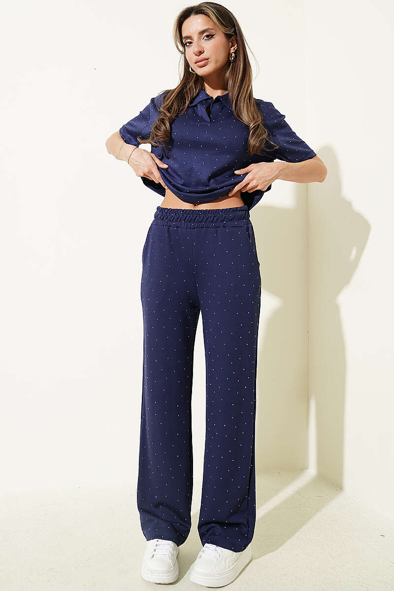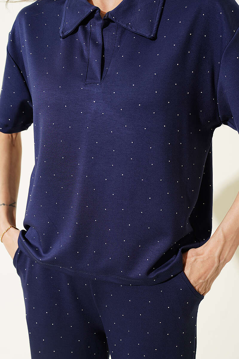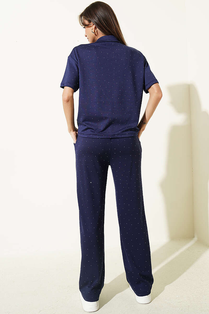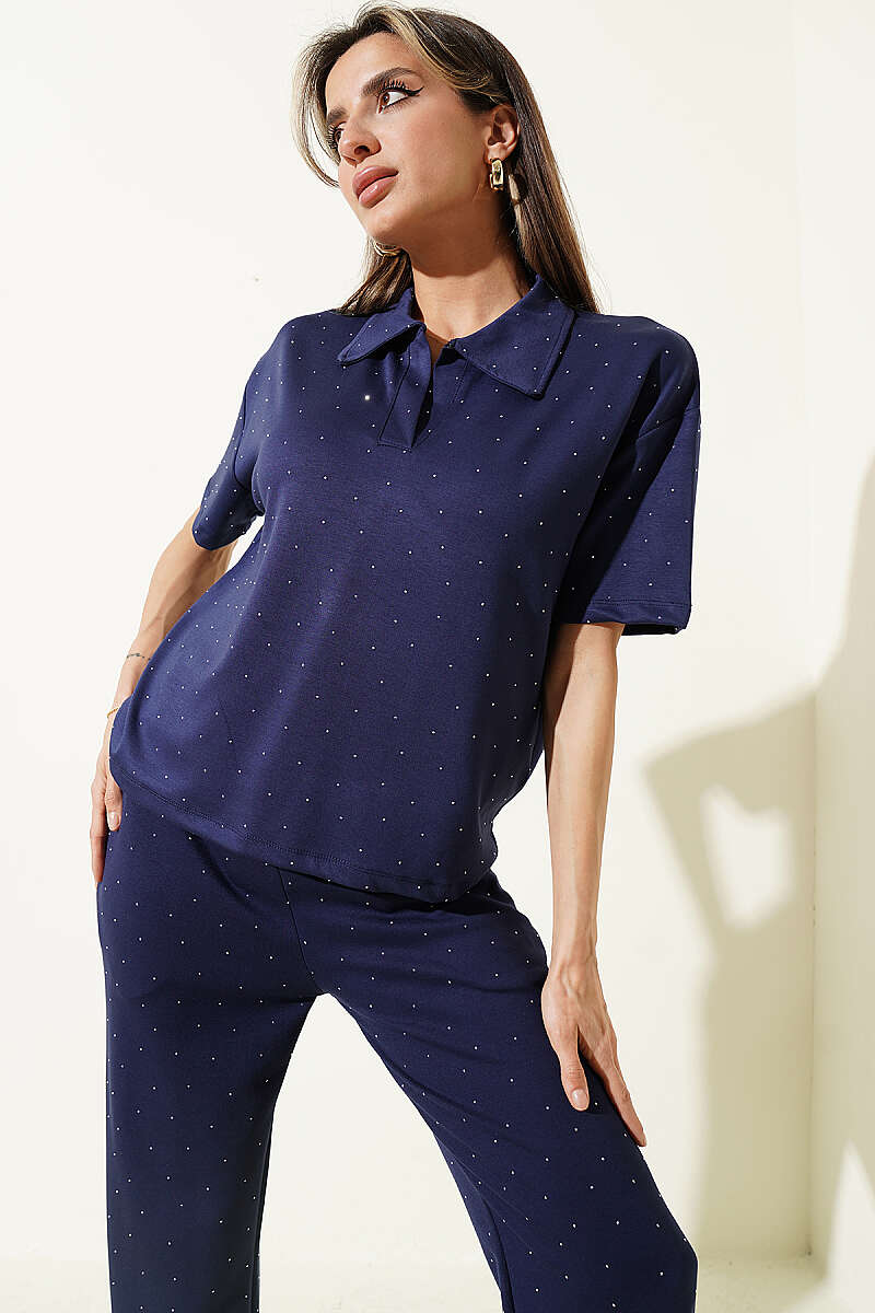 Gömlek Yaka Loyşa Taşlı T-shirt Takım Lacivert