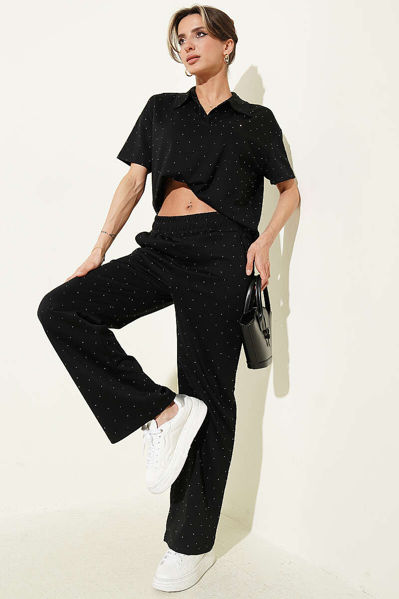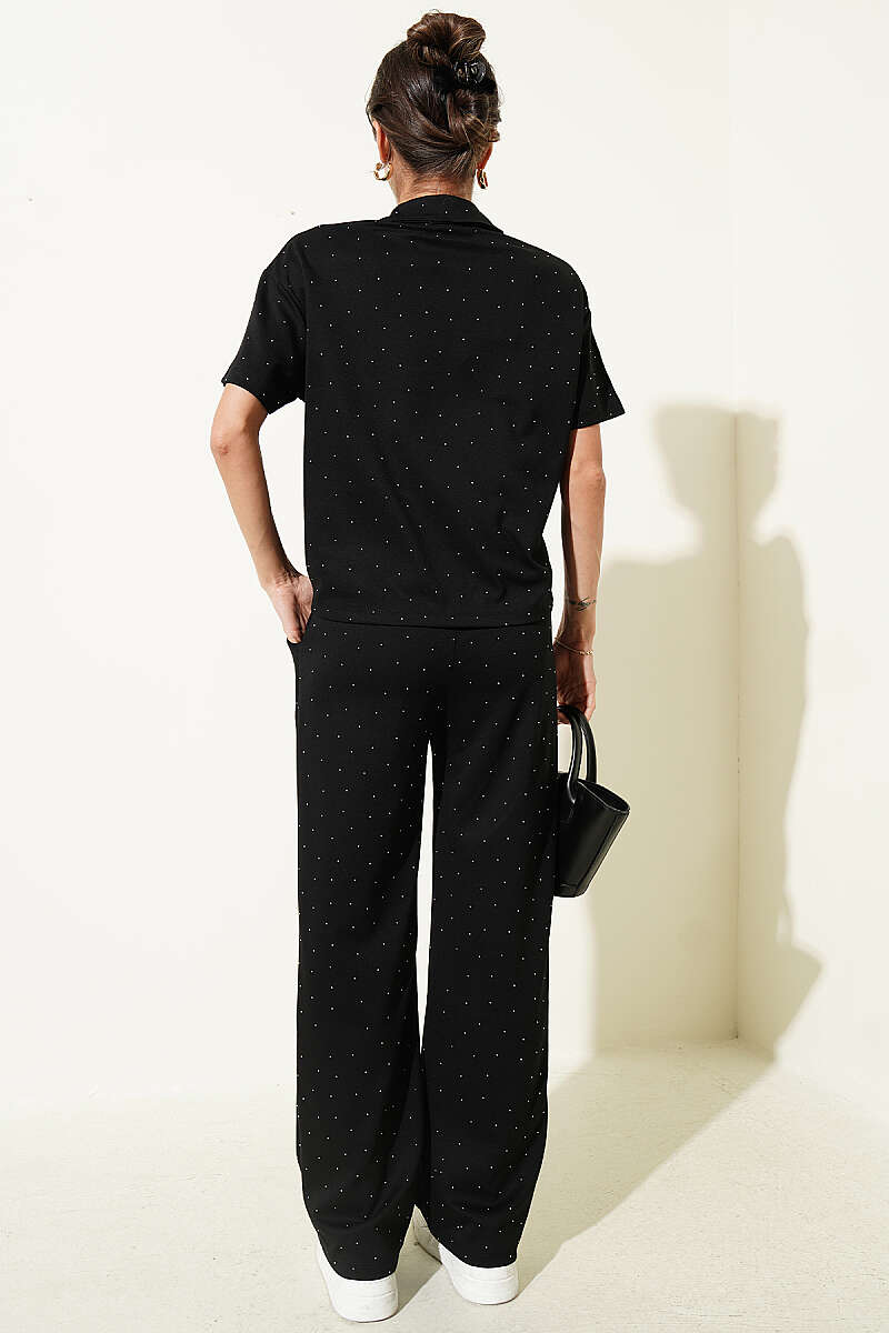 Gömlek Yaka Loyşa Taşlı T-shirt Takım Siyah