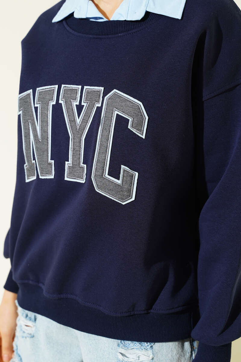 Gömlek Yaka NYC Baskılı Şardonlu Sweatshirt Gri