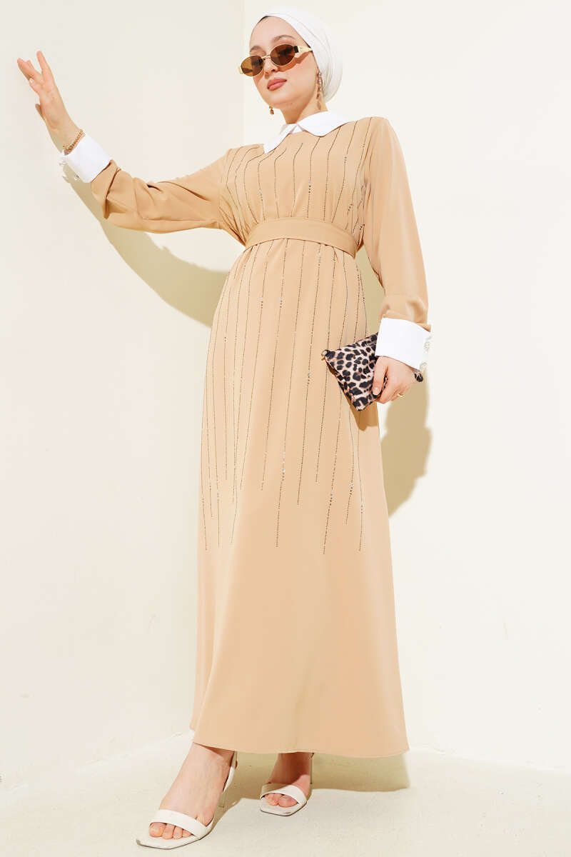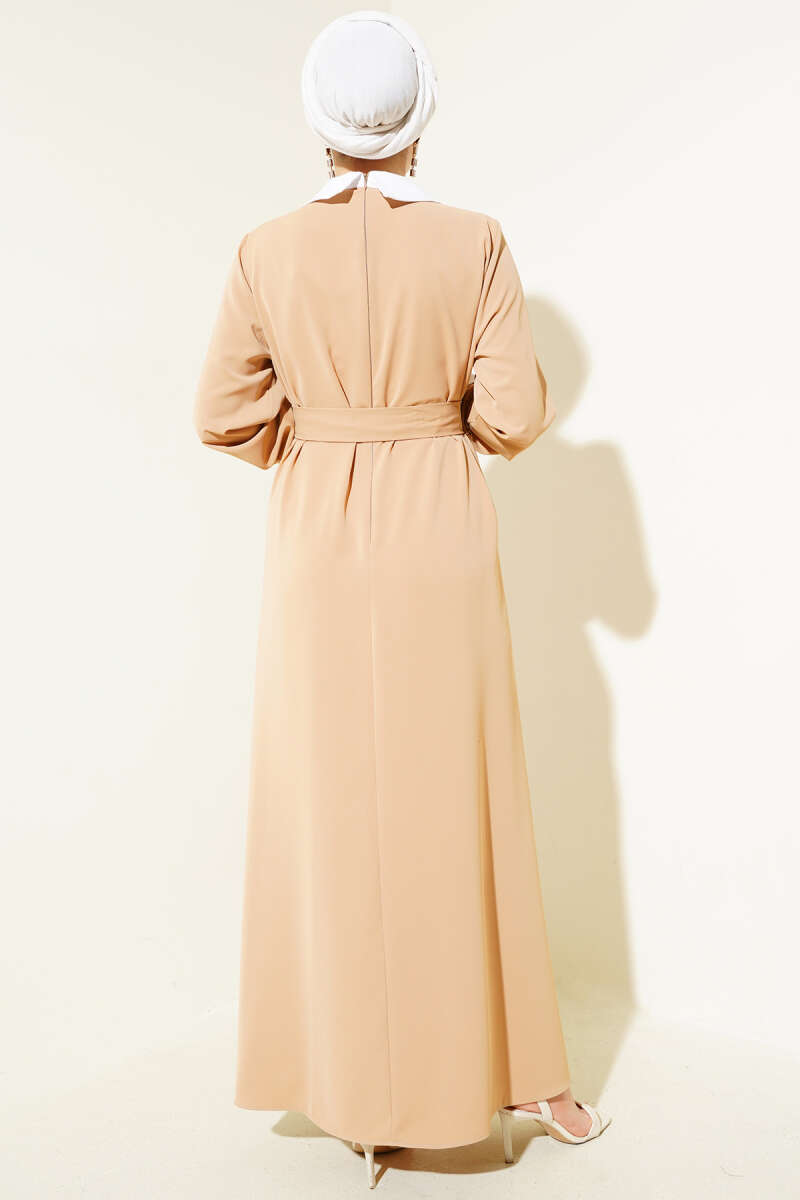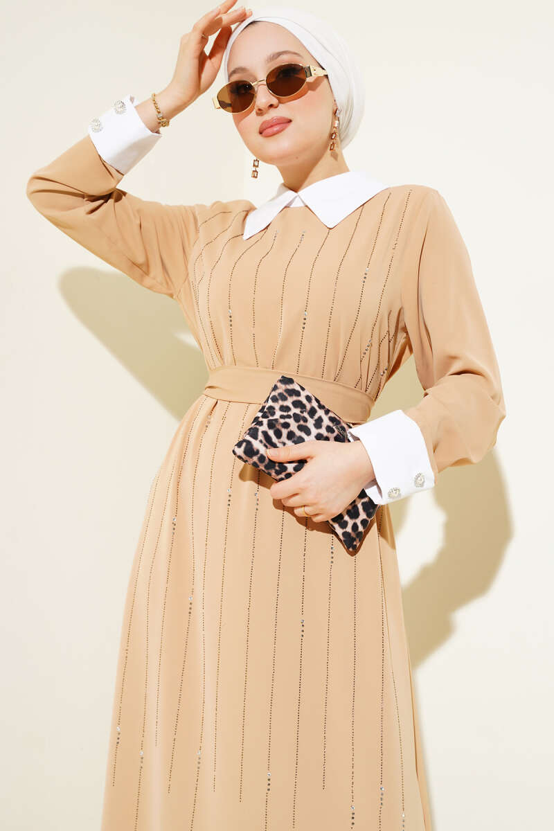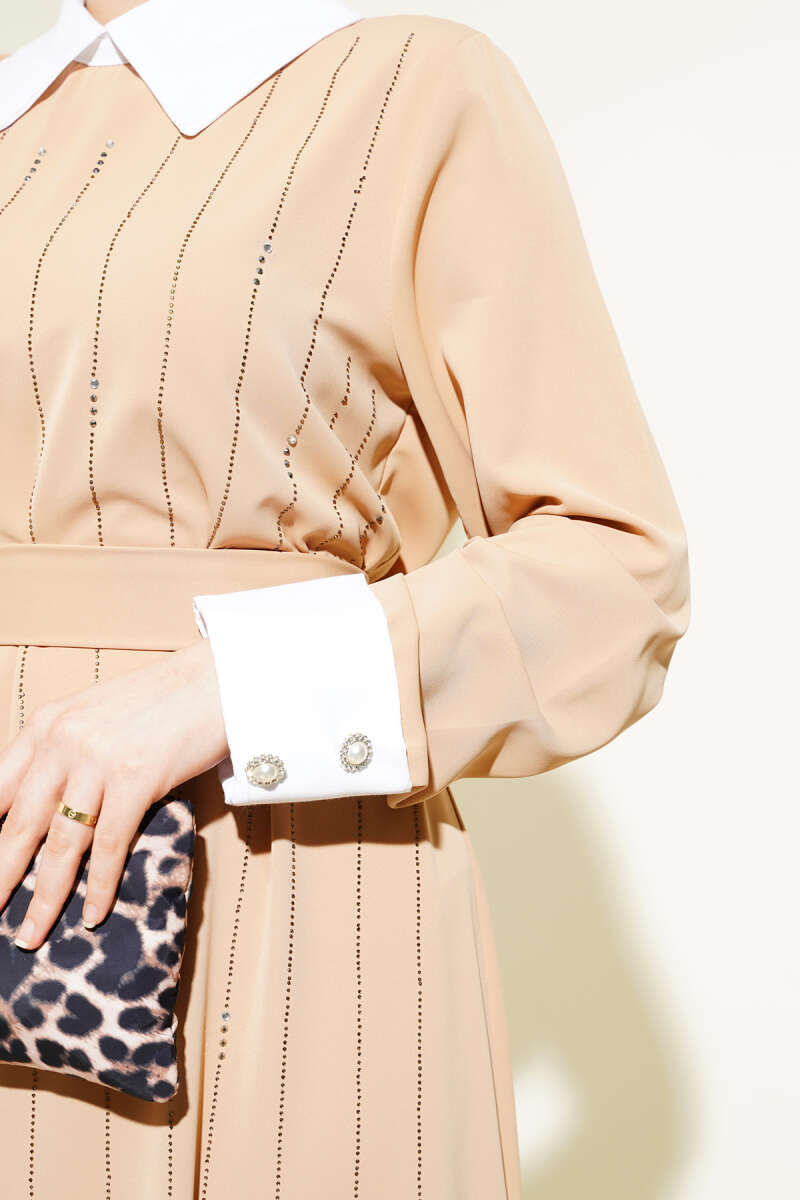 Metal Düğme Süslemeli Bağcıklı Elbise Vizon