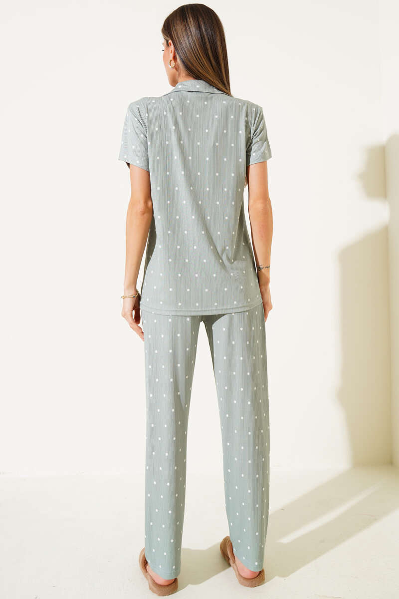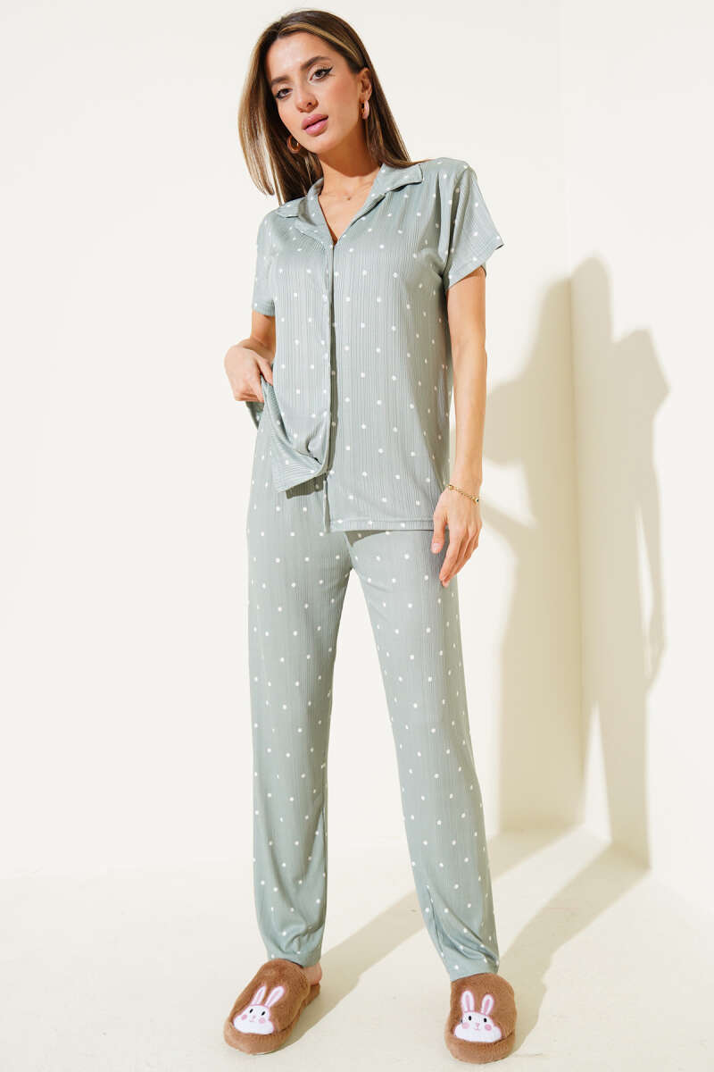 Gömlek Yaka Puantiyeli Pijama Takımı Çağla Yeşili