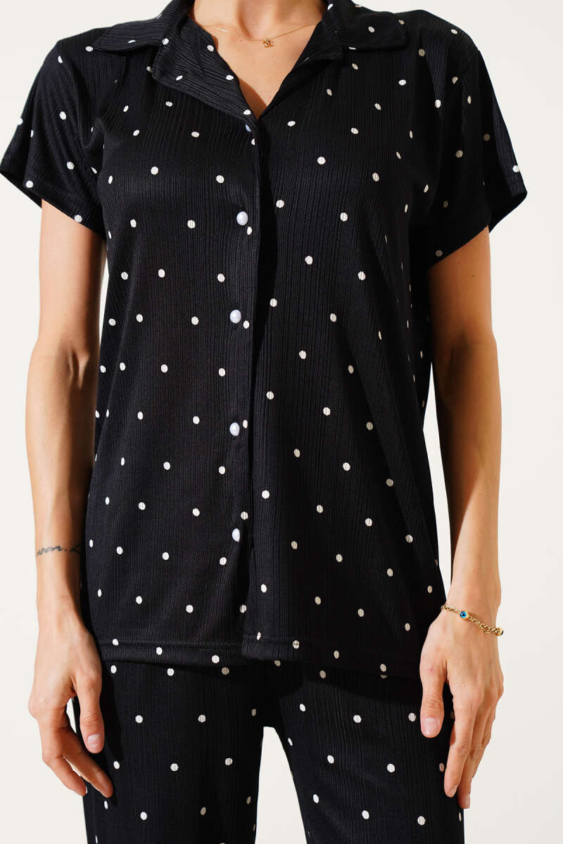 Gömlek Yaka Puantiyeli Pijama Takımı Siyah