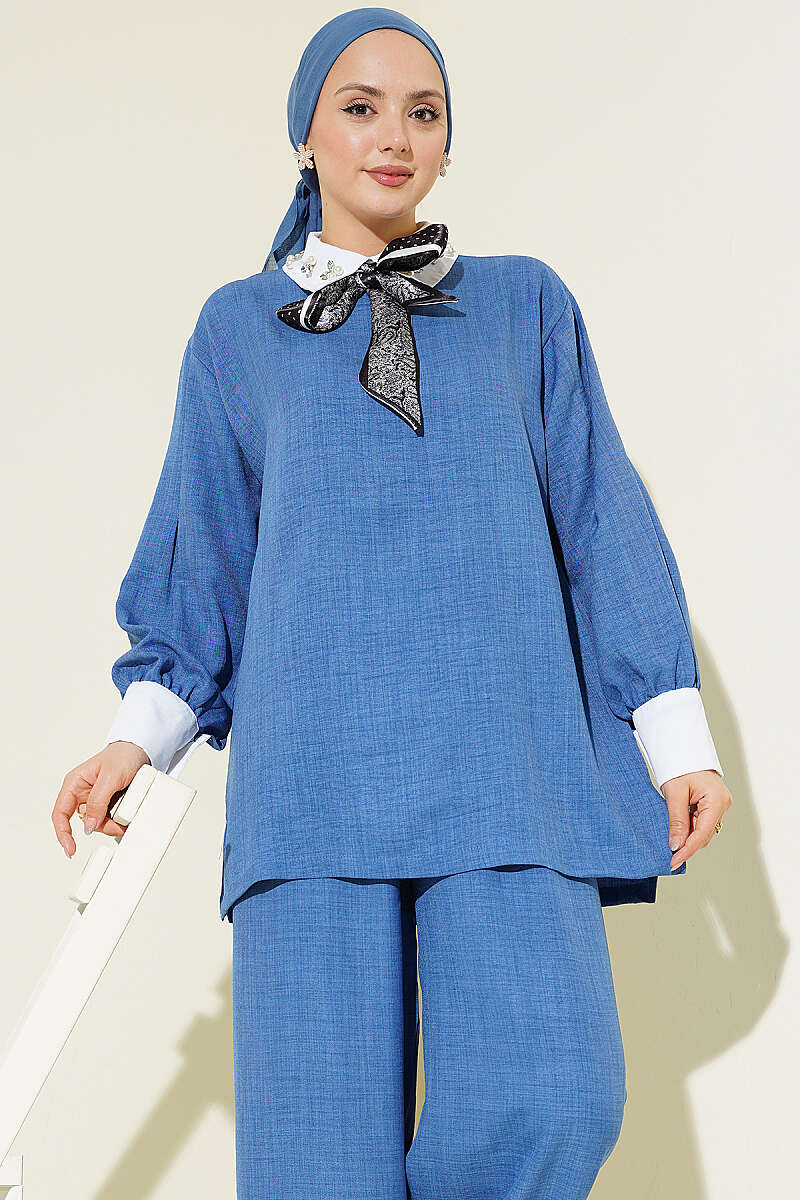 Zarif ve konforlu bir tasarıma sahip olan bu salaş ikili takım, gömlek yakasındaki ışıltılı taş işlemeleri ile sofistike bir duruş sergiler. Rahat kesim tuniğin manşetlerindeki kontrast renk geçişleri, tasarıma modern ve dinamik bir hava katar. Geniş paça pantolonu ve dökümlü kumaş yapısı sayesinde gün boyu hareket özgürlüğü sunan bu set, çabasız şıklığı her ortama taşımak için idealdir.
