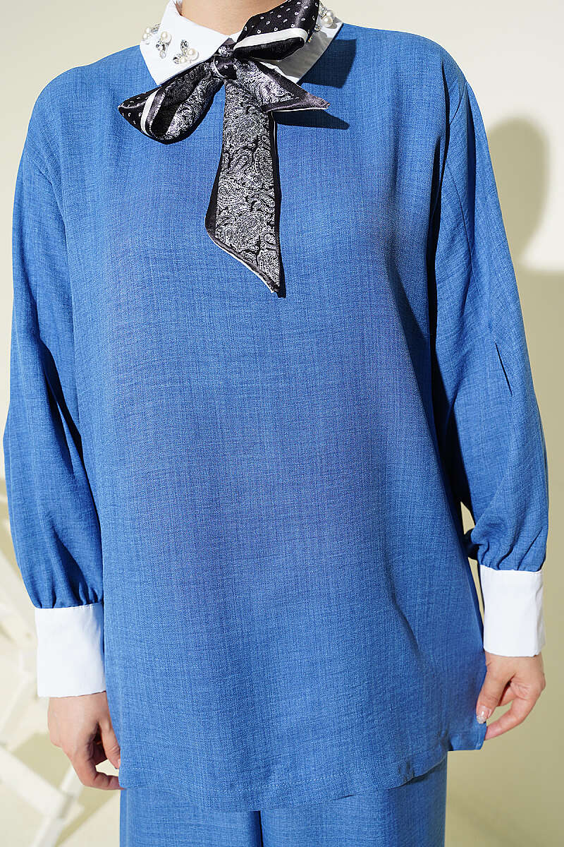 Fular Detaylı Saten İkili Takım Mavi