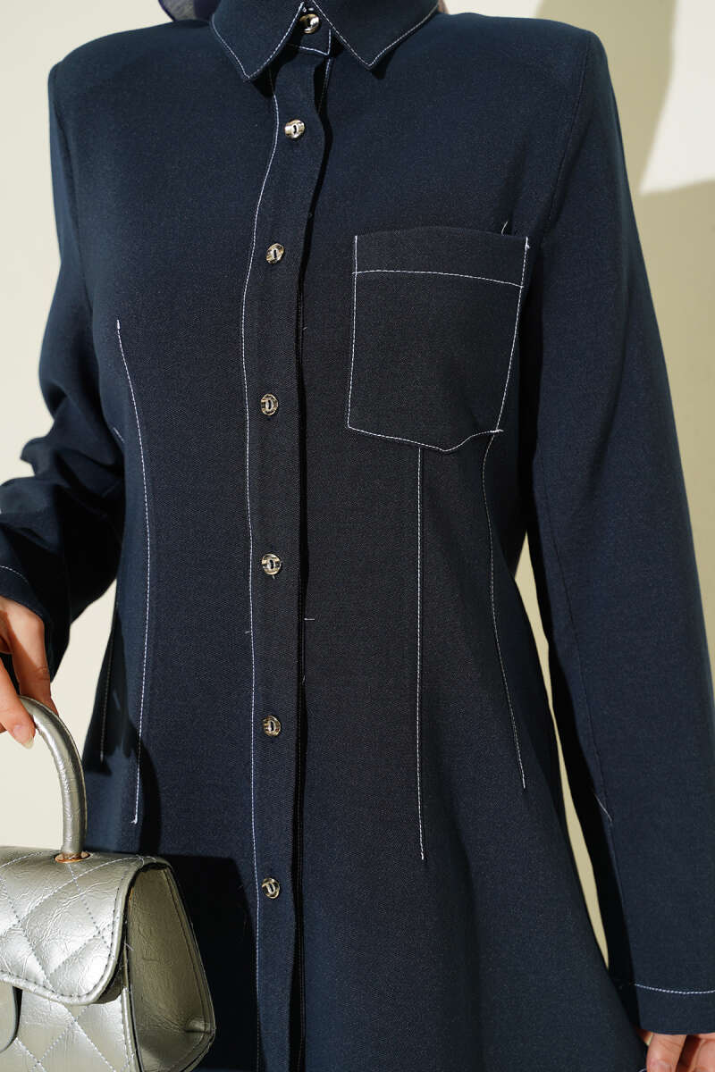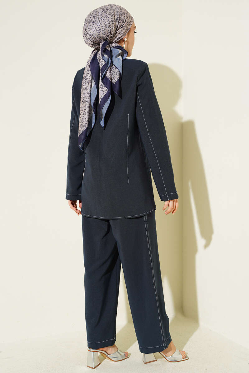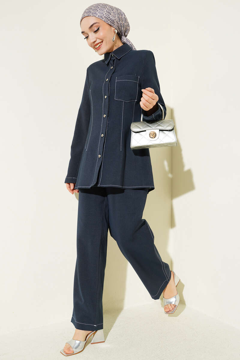 Gelince Haber VerKontrast dikiş detaylarıyla modern ve dinamik bir görünüm sunan bu ikili takım, klasik formları yenilikçi dokunuşlarla birleştiriyor. Gömlek yakalı tuniğin ön kısmındaki dikey dikiş hatları ve tek cep detayı, silüeti daha zarif ve uzun gösteren bir yapı sunarken metal düğme kapanışı şıklığı tamamlıyor.