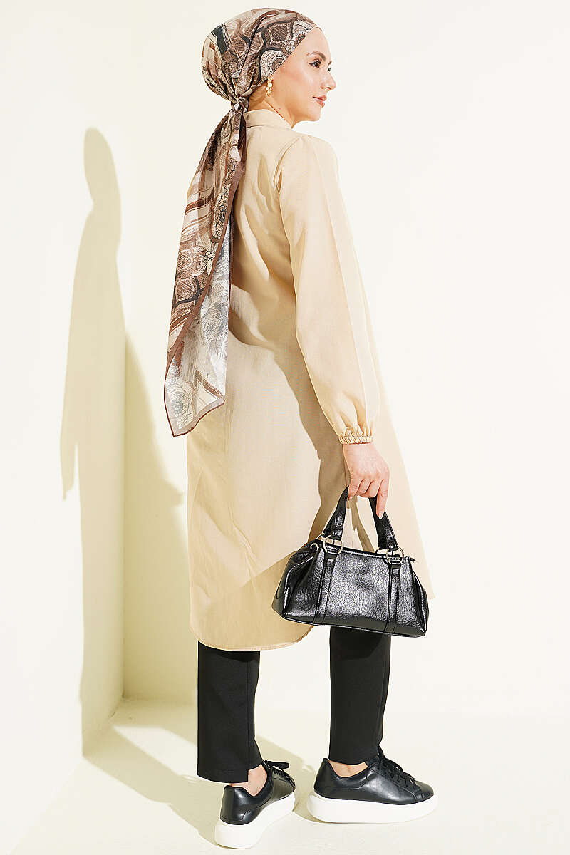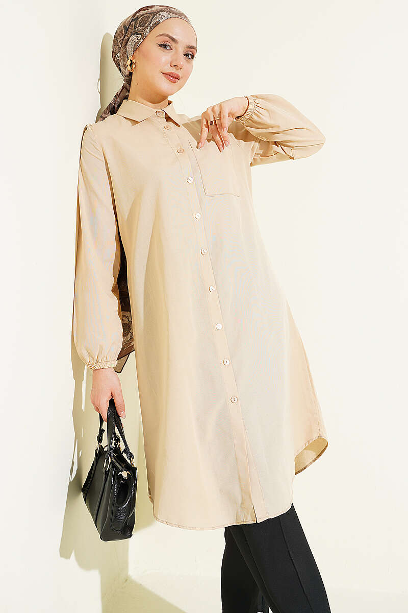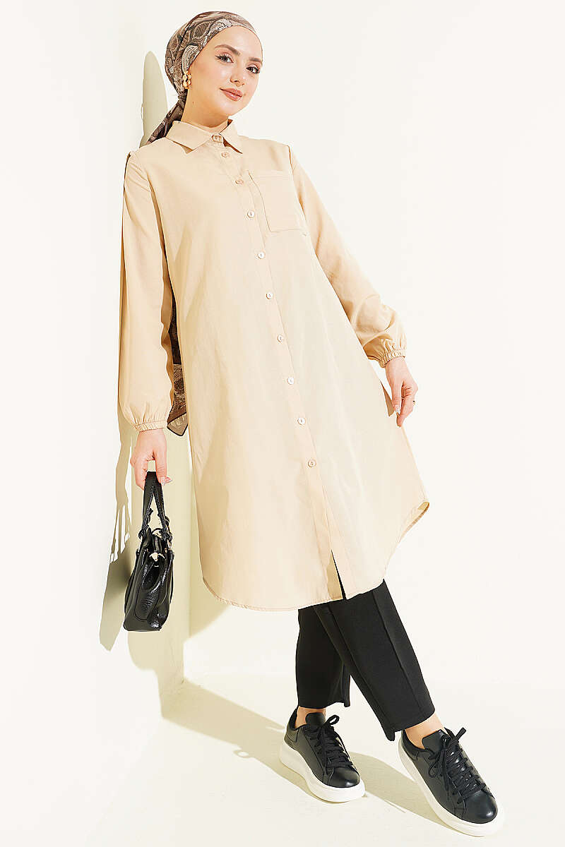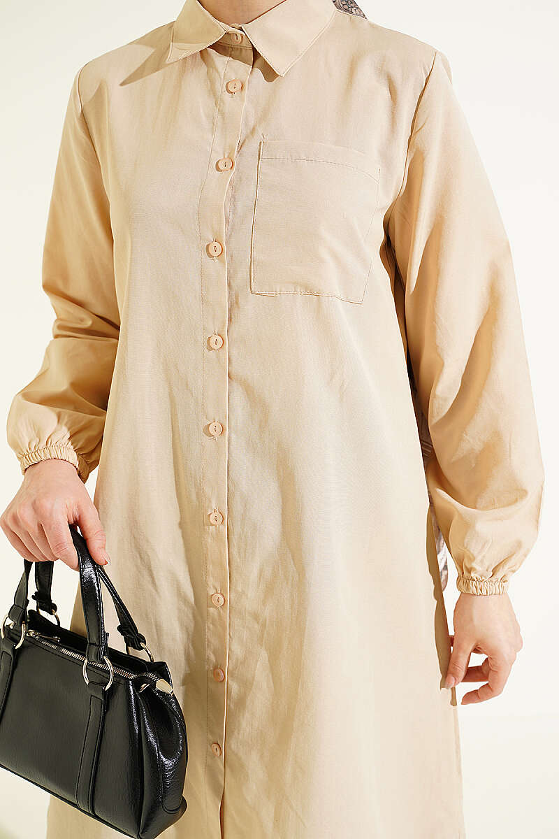 Gömlek Yaka Tek Cepli Uzun Gömlek Bej