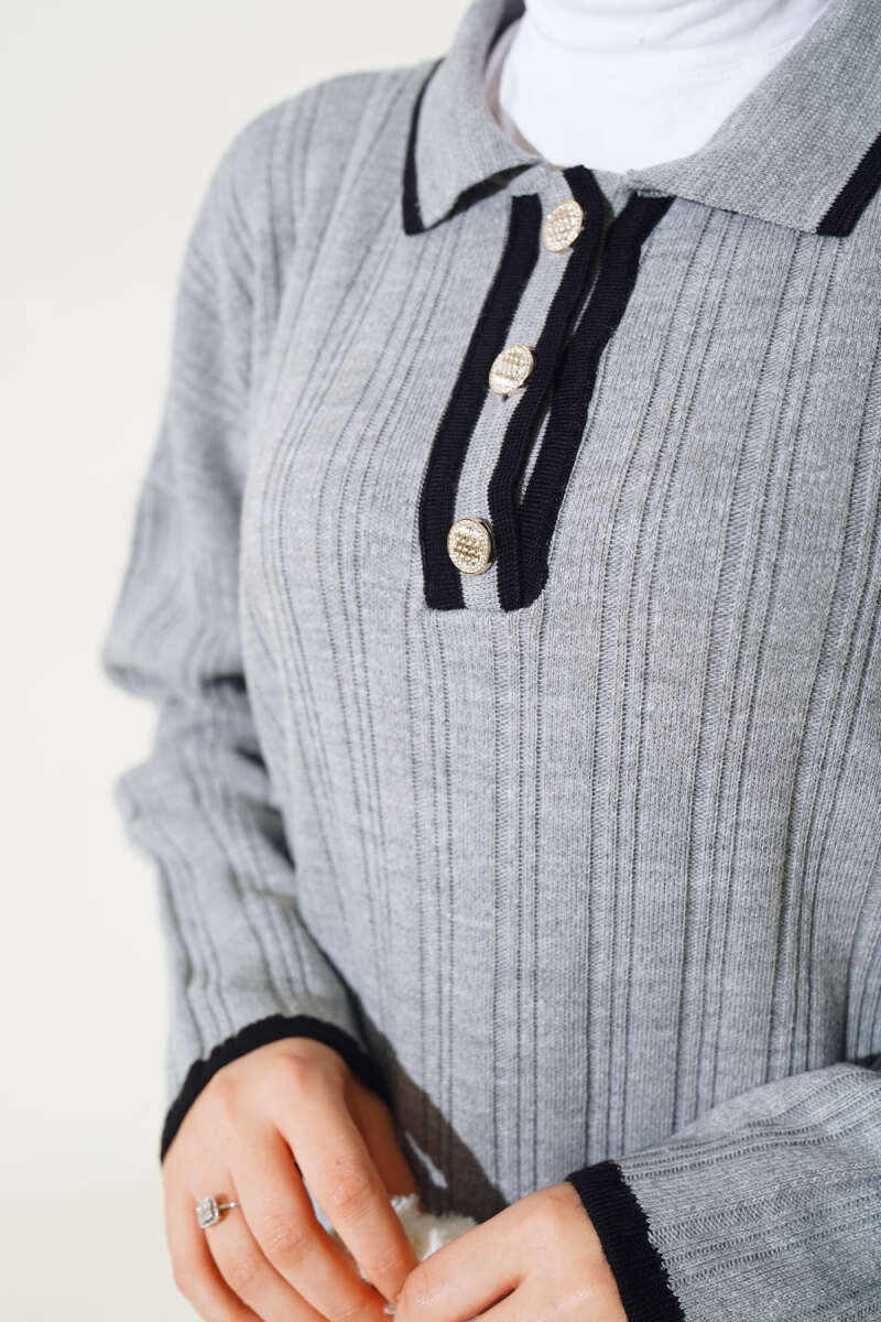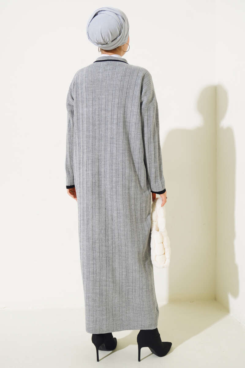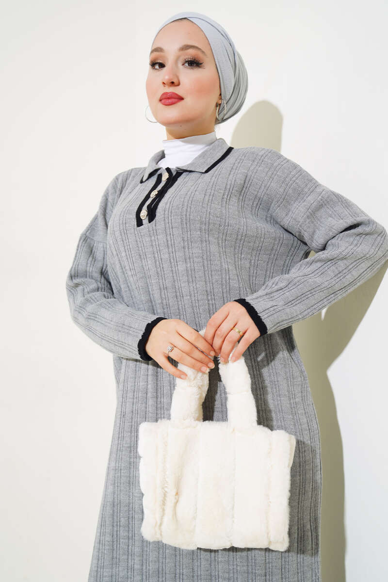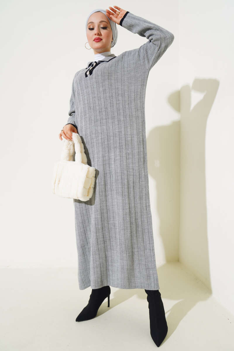 Metal Düğme Süslemeli Bağcıklı Elbise Füme