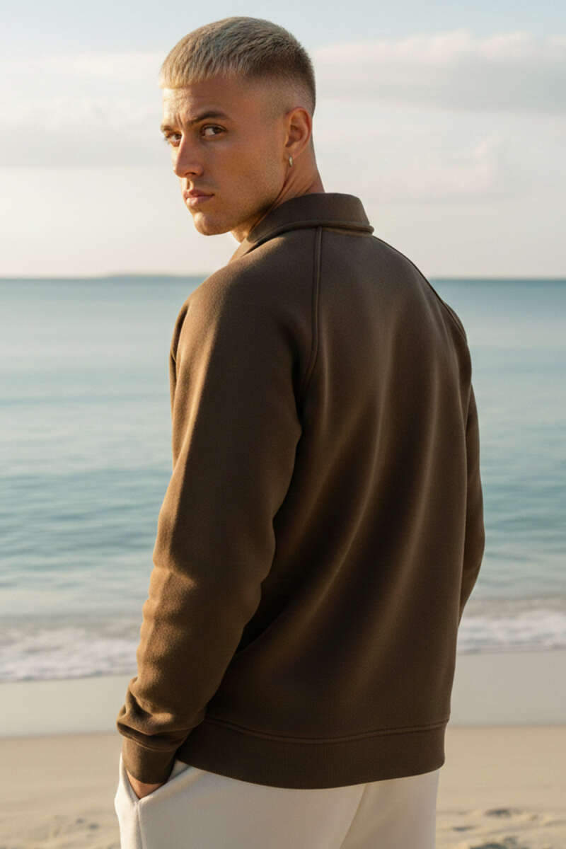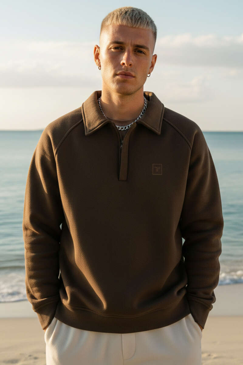 Gömlek Yaka Üç İplik Erkek Sweatshirt Kahve