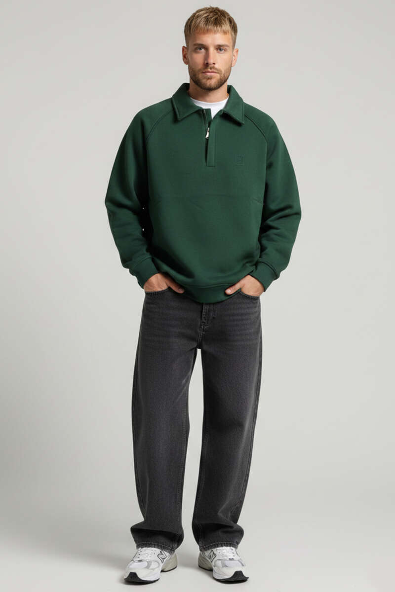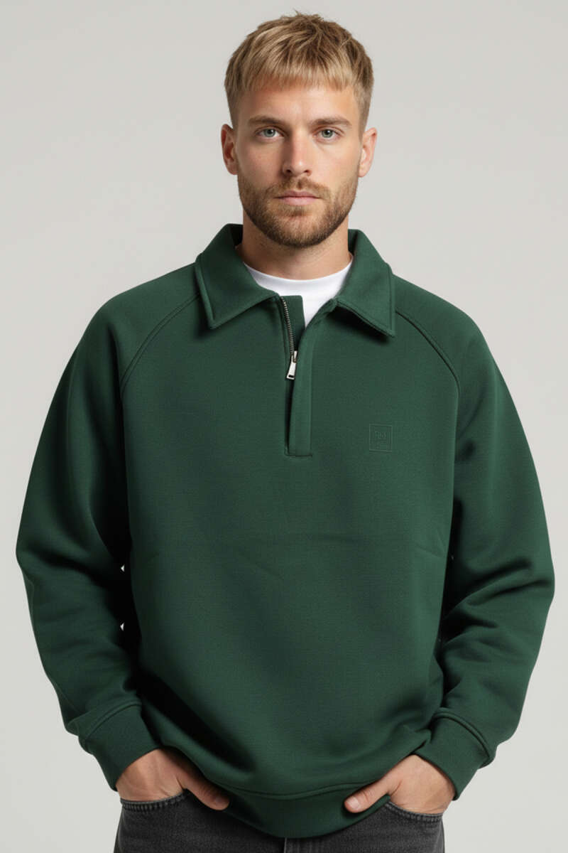 Gömlek Yaka Üç İplik Erkek Sweatshirt Siyah
