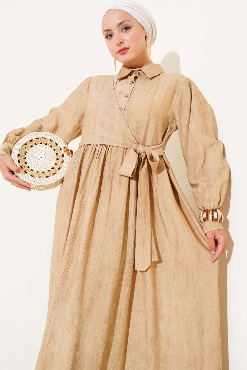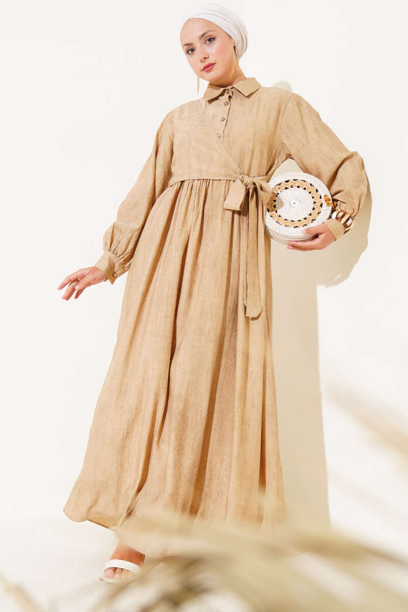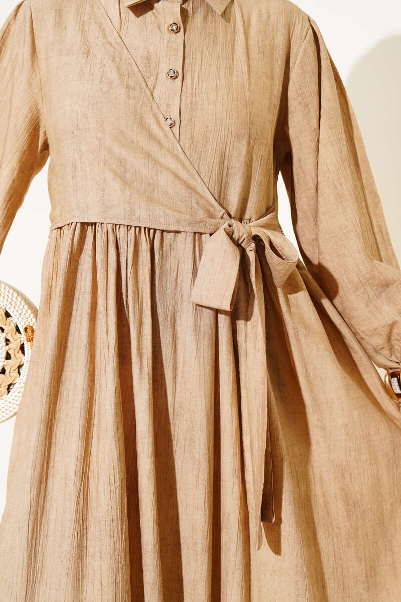 Çift İp Kuşaklı Ekoseli Elbise Bej