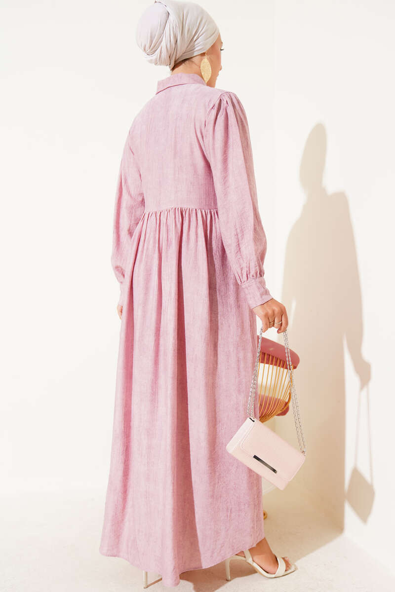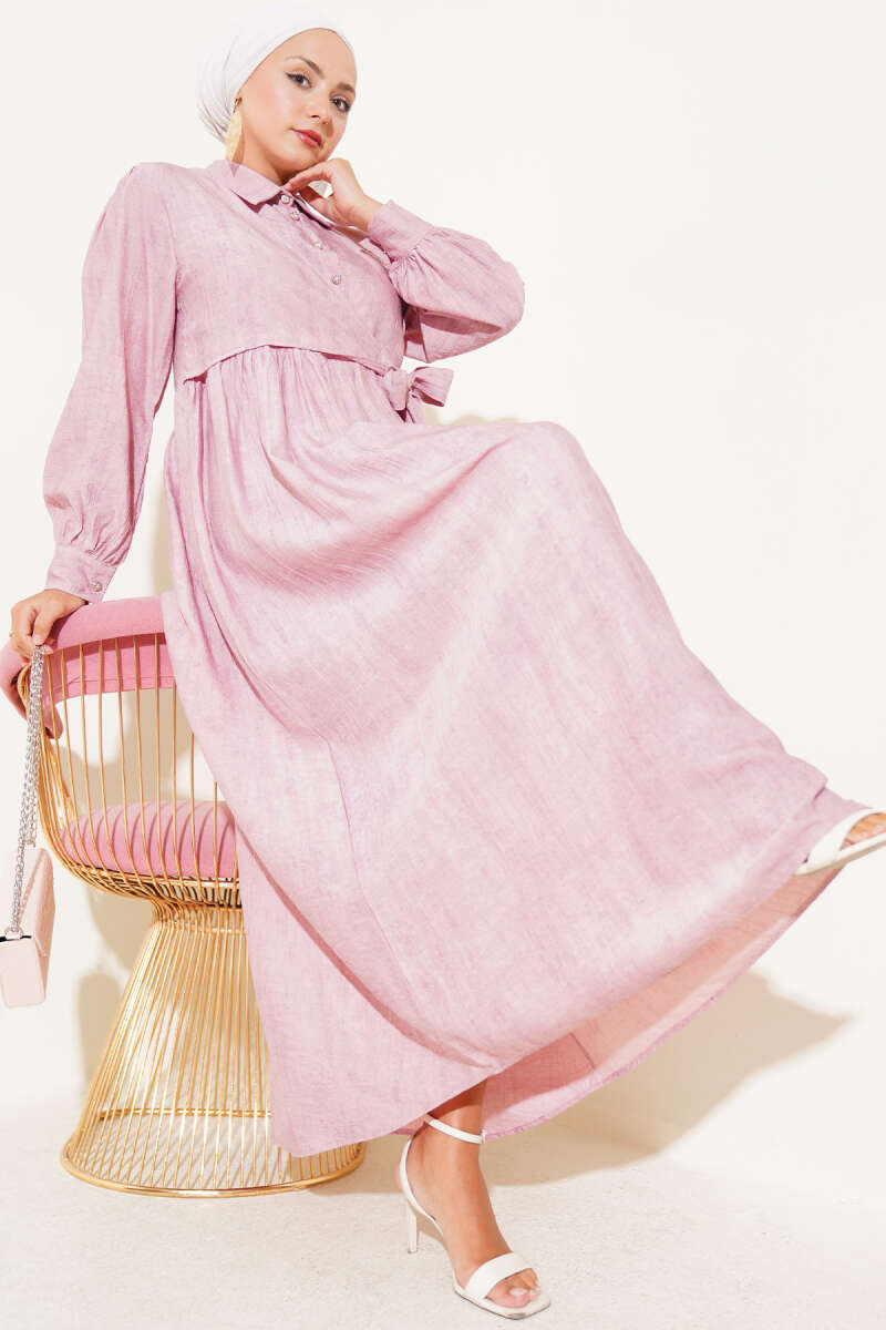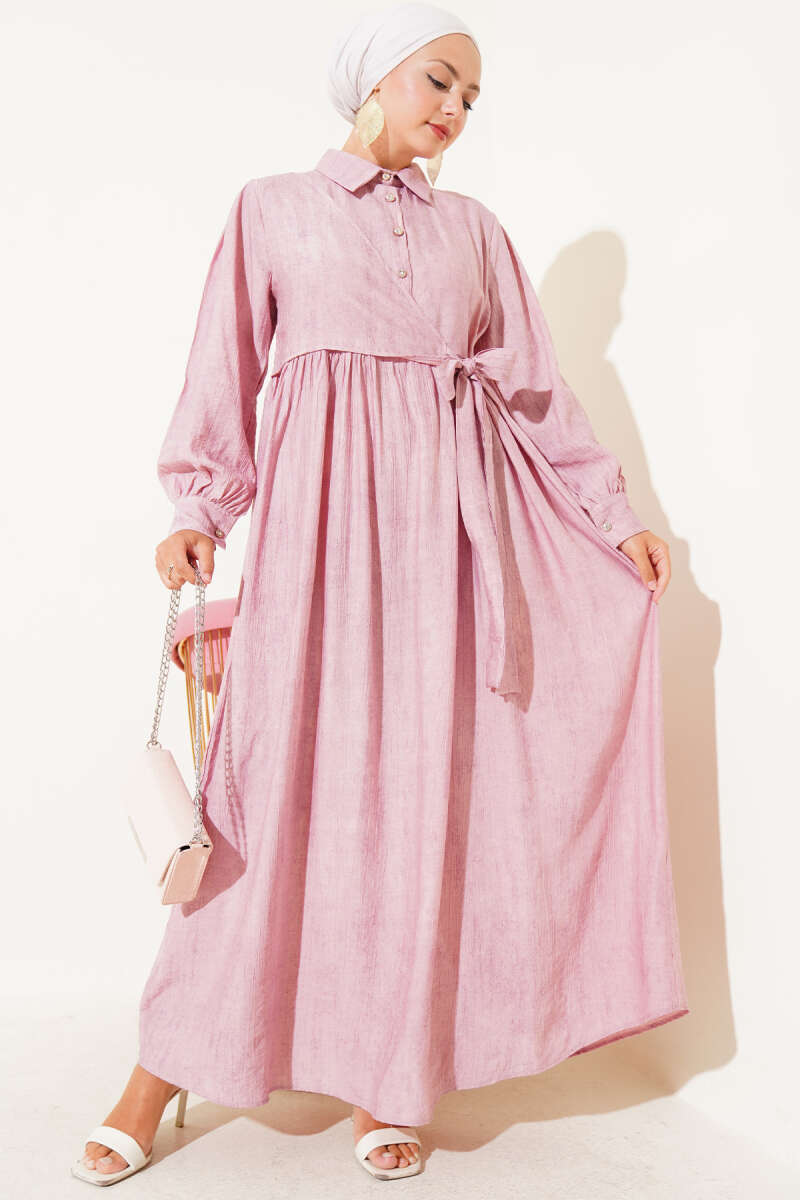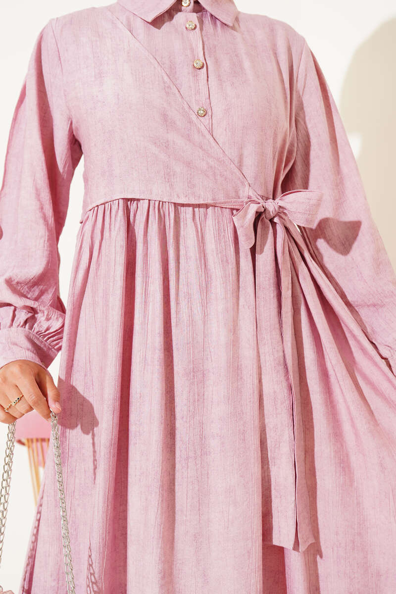 Gömlek Yaka Yandan Bağlamalı Elbise Pudra