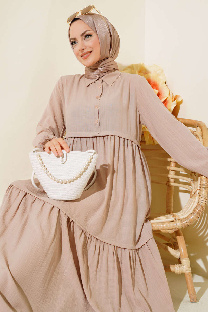 Gömlek Yaka Yarım Düğmeli Elbise Bej